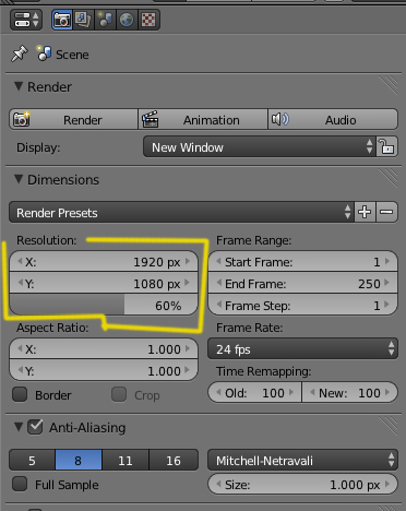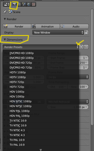 En RENDER > DIMENSIONS puedes cambiar el tamaño de la cámara, vienen varios presets (preconfigurados) con diferentes valores de tamaños más o menos oficiales.