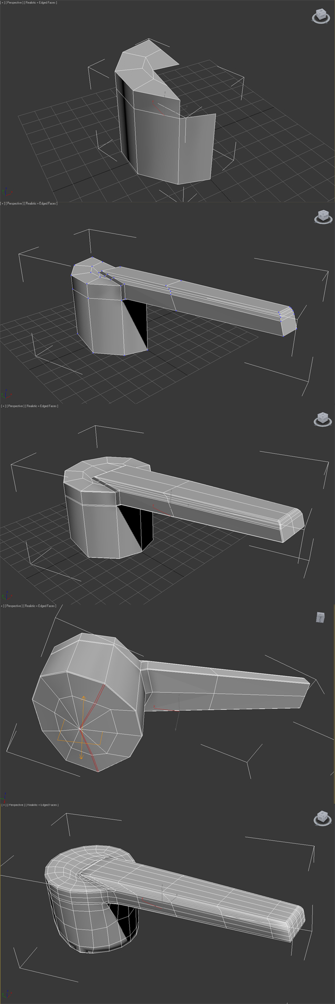 -A partir de un cilindro con pocas caras, pongamos 10 o 12 (número par, para luego eliminar la mitad y hacer la simetría al final), alinea los vértices de las caras de arriba para que coincidan con la forma del mango.
