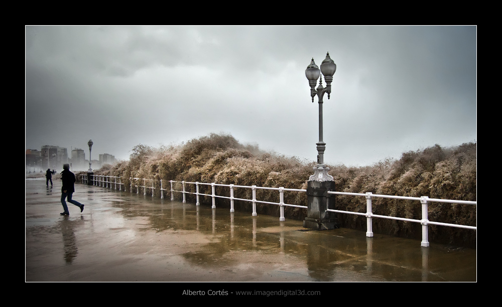 Vaya olacas que hubo el pasado lunes aquí en Gijón. Olas de hasta 11preguntaque invadían a cada poco el paseo marítimo inundando las calles. Yo, como buen aficionado a la fotografía, me bajé rápido con mi cámara a captar algún momento interesante, y vaya si lo capté, eso sí acabé caladito caladito, pero no me importó. Quería compartir esto con vosotros: