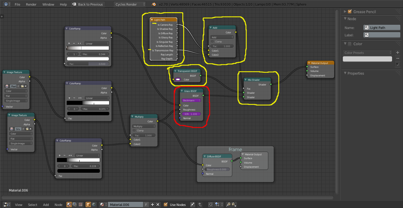 Sigo repasando los nodos de mis.blends y sigo viendo cosas que no tengo ni idea. Es de Blenderguru (el de la lámpara). Yo a partir del nodo Glass no me entero de para qué le pone encima un nodo transparent y porque le mete en el fac del mix Shader el lightpath de esa manera y forma. Seguro que tiene algún sentido. Saludos.