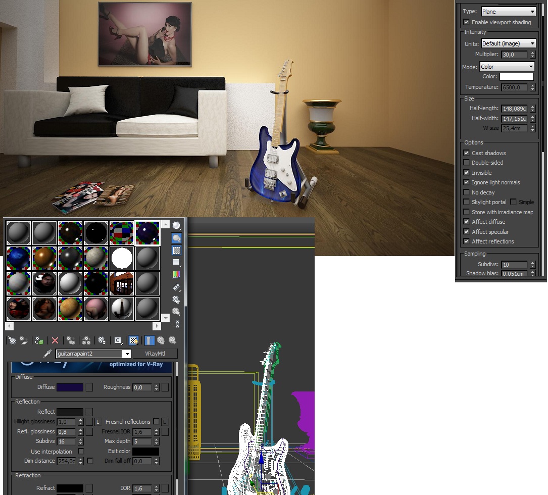 Necesito por favor que me ayuden con esta textura, al aplicarle el material, el objeto de la guitarra en el render se le nota unas líneas como negras en el borde, que la hacen remarcar mucho, cómo hacer para qué se vea más natural? Adjunto imagen con información de material de la guitarra y Vrayligh, t. Muchas gracias por su ayuda.