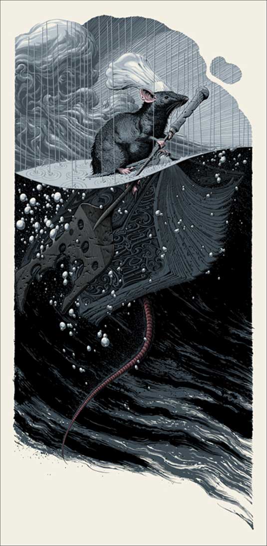 Con Ratatouille de 2007, Disney sacó lo que parecía imposible e hizo que una rata llegara a la cocina de un restaurante de manera adorable. Cartel de Aarón Horkey, sin embargo, las escalas dan una vuelta más al antropomorfismo para darnos una visión más realista sobre roedores de este tipo.