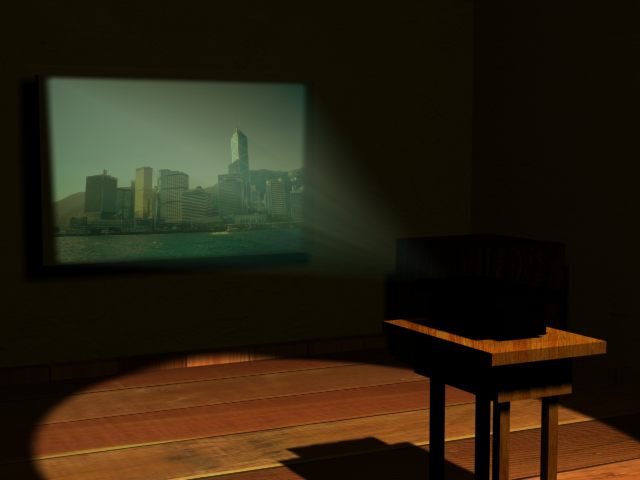 El modelado es muy simple (mesa y demás, pero lo que me interesa es la iluminación). El proyector apenas se ve, cosa que no entiendo muy bien ya que tiene un foco con objetivo justo encima, pero no quiero poner más luces, porque sino se ve todo demasiado iluminado.