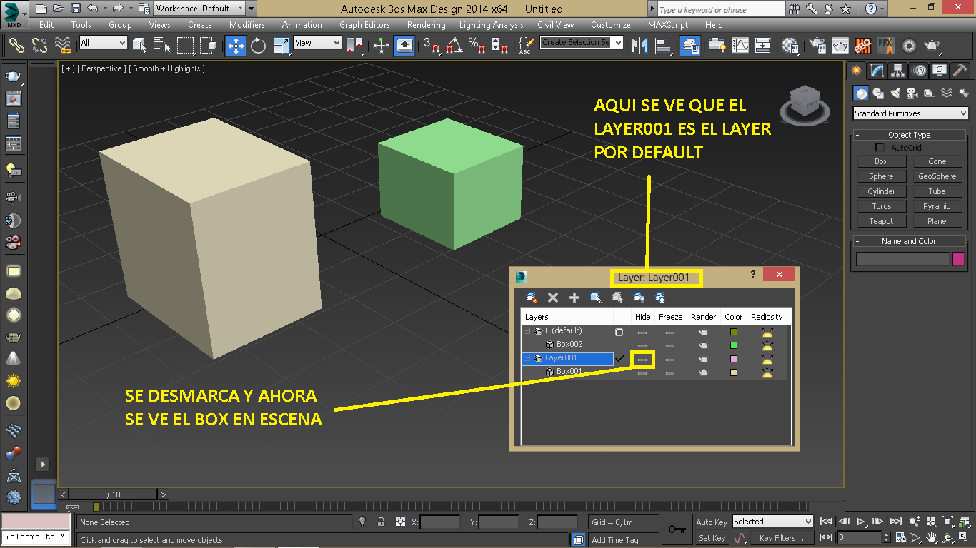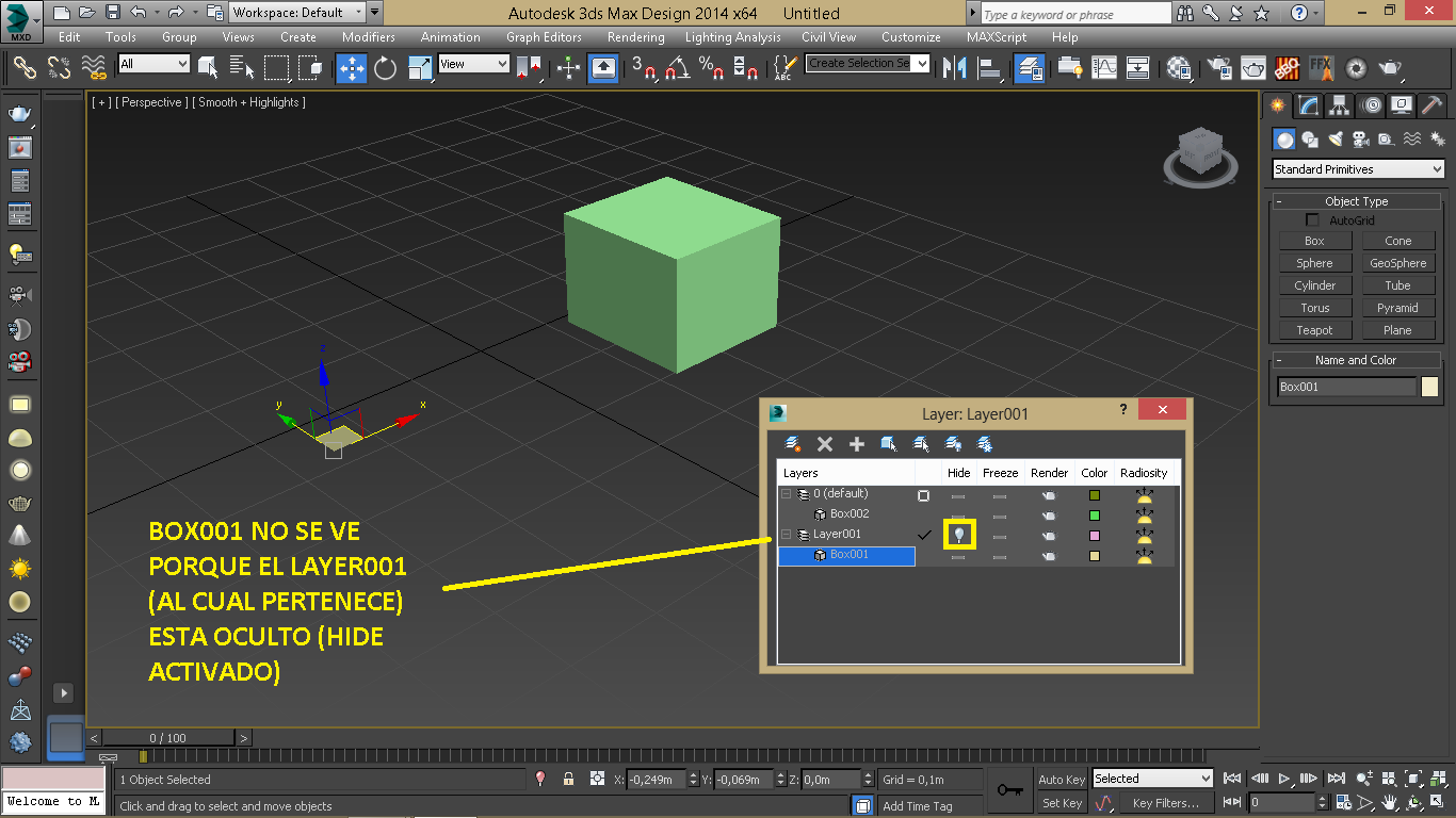 Veréis, yo voy utilizando el programa, haciendo mis cosas, tan feliz y de pronto sin saber porqué, cuando voy a crear un objeto, por ejemplo, un box, no consigo ver nada de él, es decir pincho y determino su base, anchura y altura, pero no aparece nada de el box, que ocurre con esto, que cuando terminas de crearlo sigue desaparecido y ni siquiera sabes donde esta.