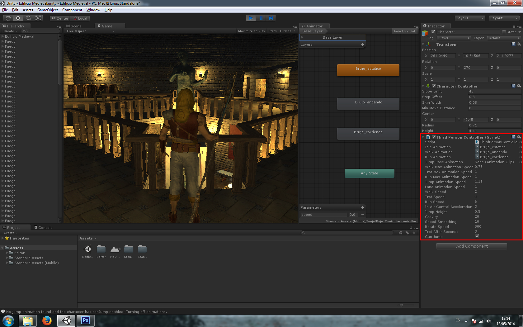 Hola a todos. Hace una semana qué estoy practicando con el Unity, para ello me he llevado un escenario y un personaje desde 3ds max. Mi intención no es más que practicar un poco haciendo que el personaje se mueva por el escenario. Estoy siguiendo unos videotutoriales, pero como no tengo ni repajolera idea de programación, me he quedado atascado en el momento en que en los tutoriales modifican el script de las transiciones de animaciones del personaje (Estatico-Andar-Correr). Yo me iba a limitar a escribir exactamente lo que el tío del tutorial escribiera, pero resulta que debe de usar una versión algo distinta de la que tengo yo del Unity (la mia es el 4.2.1), porque para él movimiento del personaje usa un script que a mí no me aparece (ya cargué todos los packs que tengo). El script que él usa se llama Character Movement, sin embargo, yo lo más parecido que tengo es el que he usado, llamado Third Person Controller. Cuando lo he abierto para modificarlo era muy distinto del que aparecía en el tutorial, y no sé por dónde meterle mano. Vengo aquí a preguntar a ver si alguien sabe dónde me puedo bajar ese script en concreto (he buscado en la página de Unity, en la sección de scripts y no lo he encontrado, no sé si se me habrá pasado) o dónde hay un buen tutorial que explique cómo hacer que el personaje salte a la animación de andar cuando se pulse W y a la de correr cuando se pulse Shift, no es más que eso. Ya tengo todas las animaciones preparadas, lo único que no sé qué tengo que poner en las transiciones para qué el personaje las use cuando corresponden. Dejo una captura del proyecto (las transiciones las borré porque al darle al play el personaje se volvía loco). Gracias a quien me escuche, un saludo.