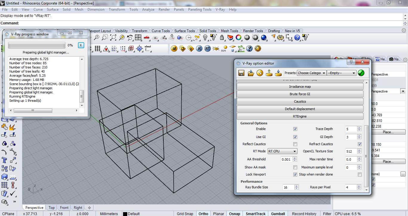Buenas. Tengo un problema con la vista Vray RT en Rhinoceros, siempre que lo activo la ventana emergente queda como cargando y nunca puedo ver el render a tiempo real, únicamente me deja ver la vista en modo alámbrico.