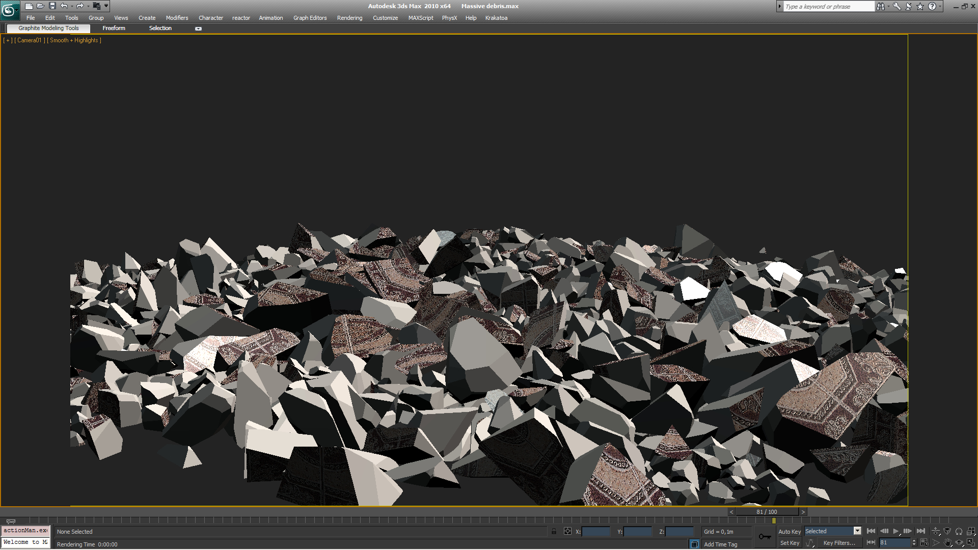 Simplemente paso a comentar que he probado el material Rayfire Asperity en esta escena con 35 mil escombros, dado que el modificador RayFire Asperity Modifier me generaba tanta geometría qué el sistema colapsaba.