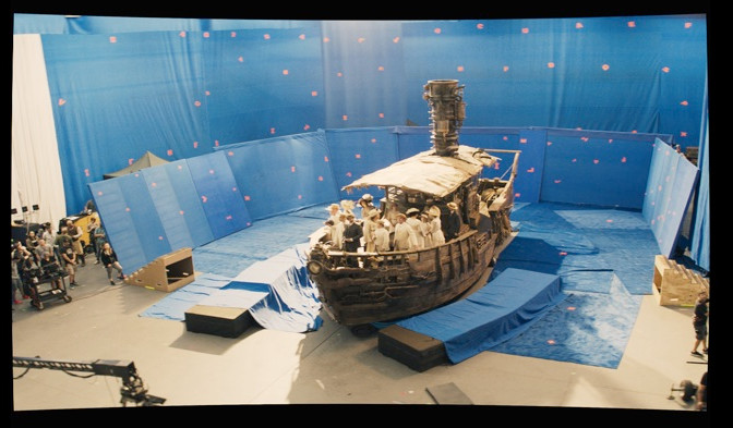 Las secuencias del barco se grabaron en un tanque de agua en Atlanta. Hubo un par de tomas en las que el barco estaba en un cardán. Luego para otras tomas se agregaron un poco de movimiento a los fondos. Para darle un poco de vida a la escena. También hay algunas escenas que se hicieron con el barco completo dentro del estudio, sin agua a su alrededor, todo contra una pantalla azul en la que después se añadiría el entorno CG.