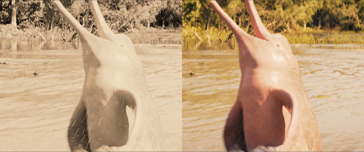 Los delfines han resultado divertidos de representar en CG. El equipo pasó una buena cantidad de tiempo diseñando esos delfines, porque esos delfines rosados del Amazonas existen. Se ven horribles, pero existen. Son una mezcla entre los clásicos delfines grises y belugas. Muy arrugados, y están casi ciegos porque la visibilidad en el río Amazonas es casi nula. Así que el equipo creativo decidió crear un delfín con un término medio entre los rosados del Amazonas y los grises conocidos por todos.