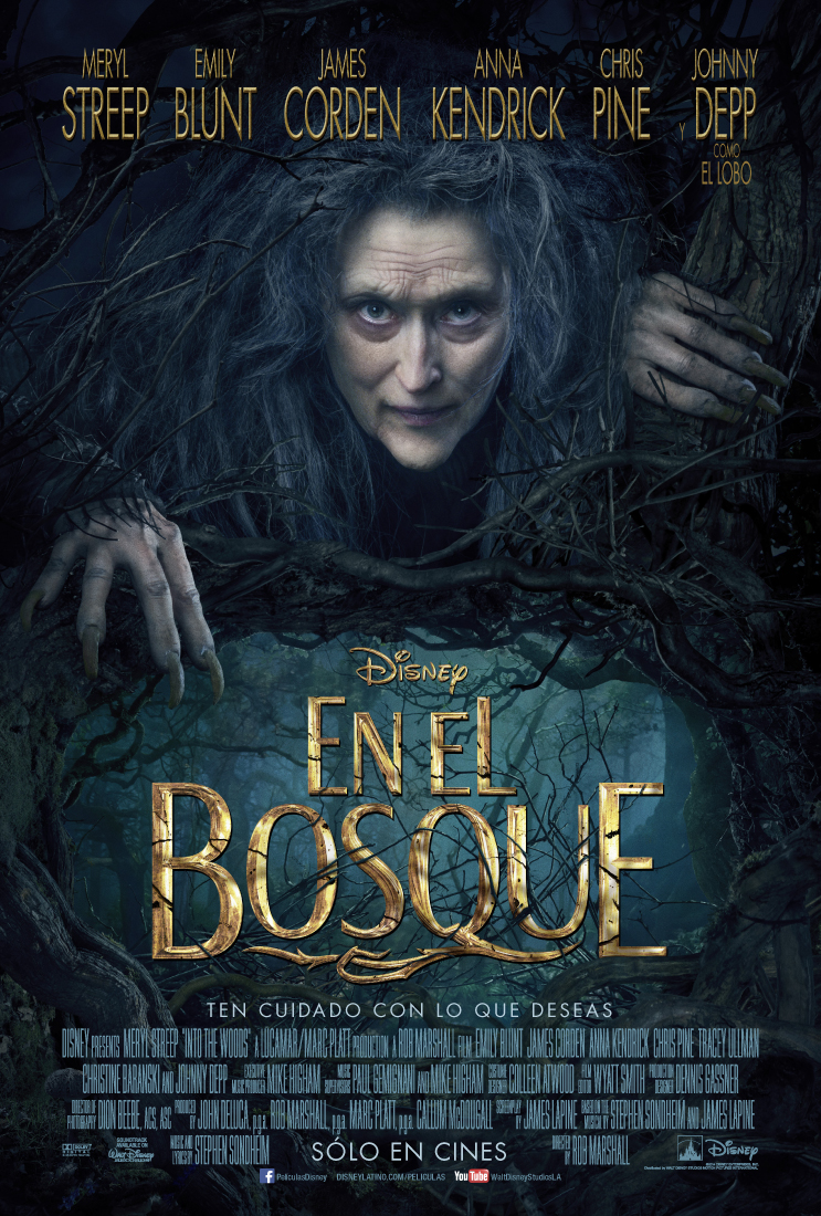 Imágenes oficiales de la nueva película de Disney, En el Bosque, un musical de Broadway adaptado a la gran pantalla, la historia se centra en la vida de una pareja, ambos desean tener hijos y formar una familia, pero están malditos por una bruja, la bruja los hace pasar por todo tipo de peripecias, relacionándolos con otros personajes de cuentos populares, como Caperucita Roja o Cenicienta. El reparto cinematográfico estará encabezado por Meryl Streep, Johnny Depp, Lucy Punch, Emily Blunt, James Corden, Tracy Ullman, Chris Pine, Anna Kendrick, y Christine Baranski.