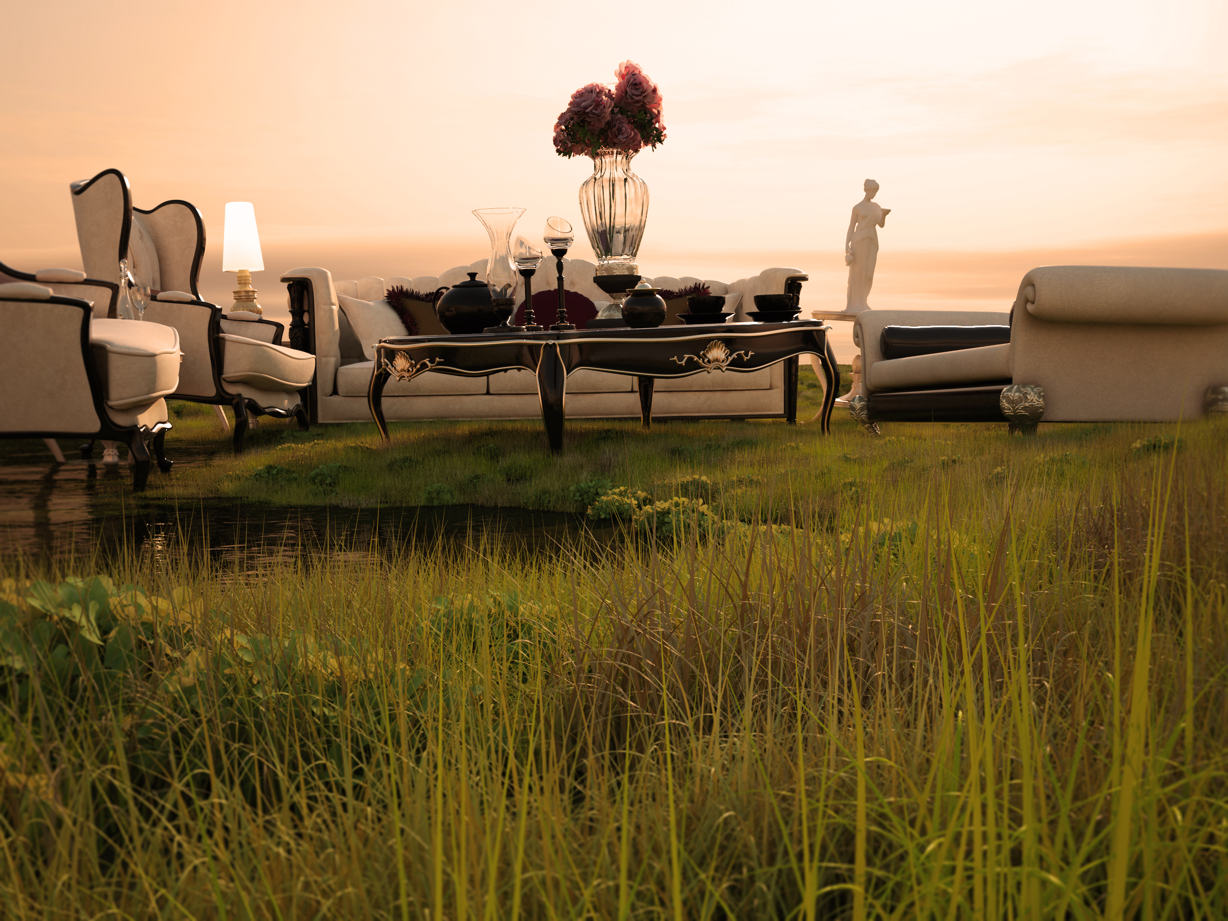 El environment, atmósfera y cielo es DreamScape combinado con VraySky y VraySun, el DreamScapeSun (obligatorio para qué DreamScape funcione) no ilumina la escena, esta excluido, la luz directa la hace el Vray Sun solo.