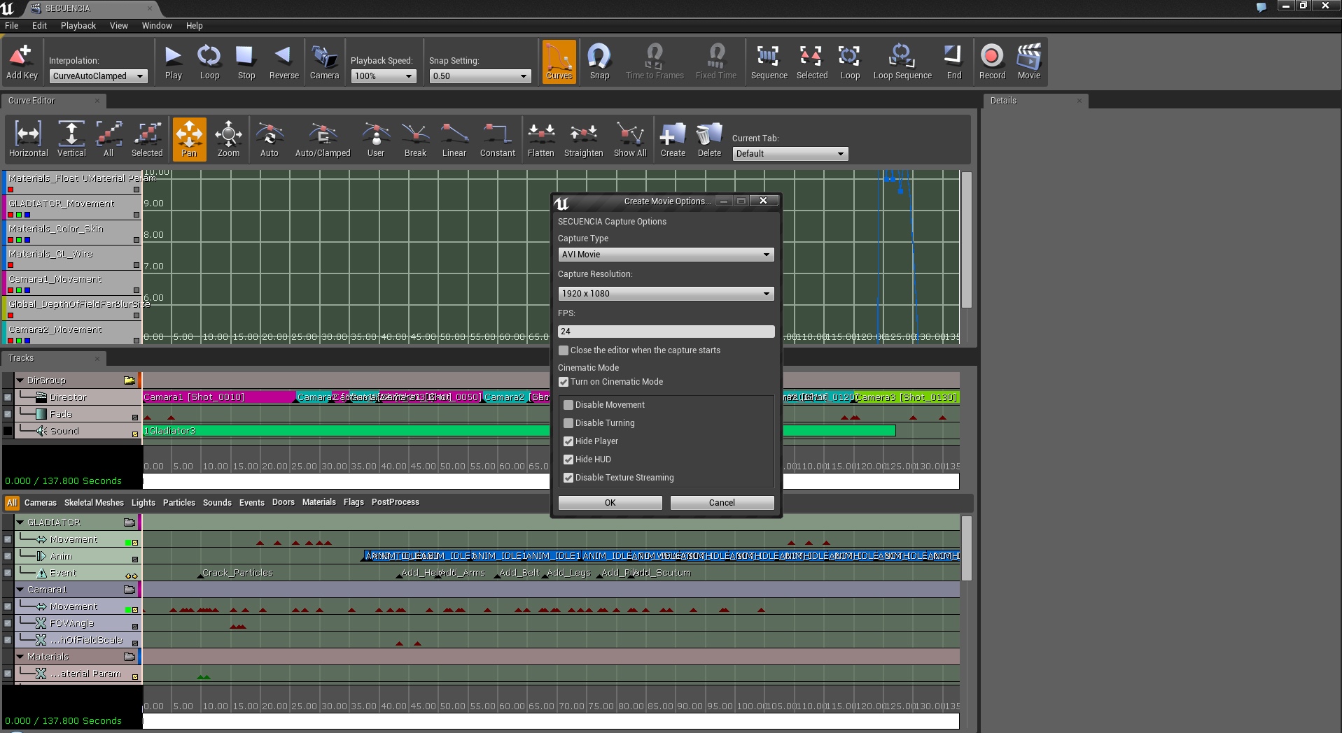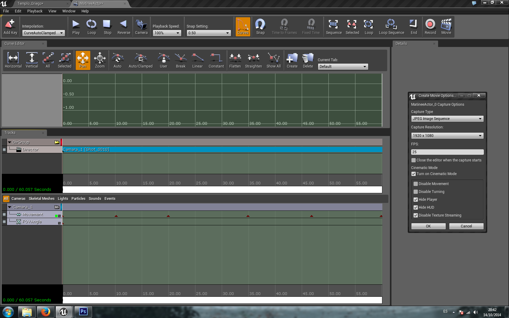 Hola a todos, hace poco que he empezado a aprender a manejar el Unreal Engine 4. Para empezar, antes de hacer nada con personajes o programación, me propuse hacer un escenario simple con una malla fija y hacer un recorrido con la cámara. Para exportar la secuencia de imágenes supuestamente solo hay que ir al botón de Movie dentro del menú de Matine y ahí poner las propiedades de las imágenes o el video que quieres exportar. Esto lo he leído en varios foros y se lo he visto hacer a un chaval en youtube. Pero cuando yo lo hago pasa una cosa muy rara: cuando se abre la ventana del video renderizandose, aparece una vista por debajo del terreno que además puedo mover con el ratón (supuestamente está pantalla no es interactiva, sino que solo muestra lo que se está renderizando desde la cámara), no se exporta ninguna imagen, solo se ve esta vista fija. En el Matine tengo creada una pista con la cámara y su animación, y también una pista con el director (no se si el director era necesario, pero el chaval de YouTube lo hacía y le iba bien, así que, hice lo mismo, pero nada). No sé qué puede ser, llevo dos días solamente intentando resolver esto, he mirado también el manual de Unreal Engine, no encuentro ningún sitio donde pase el fallo que me da a mi o algo parecido. Si alguien que entienda de este motor se le ocurre qué puede ser, agradecería mucho que me echase una mano. Muchas gracias a todos.