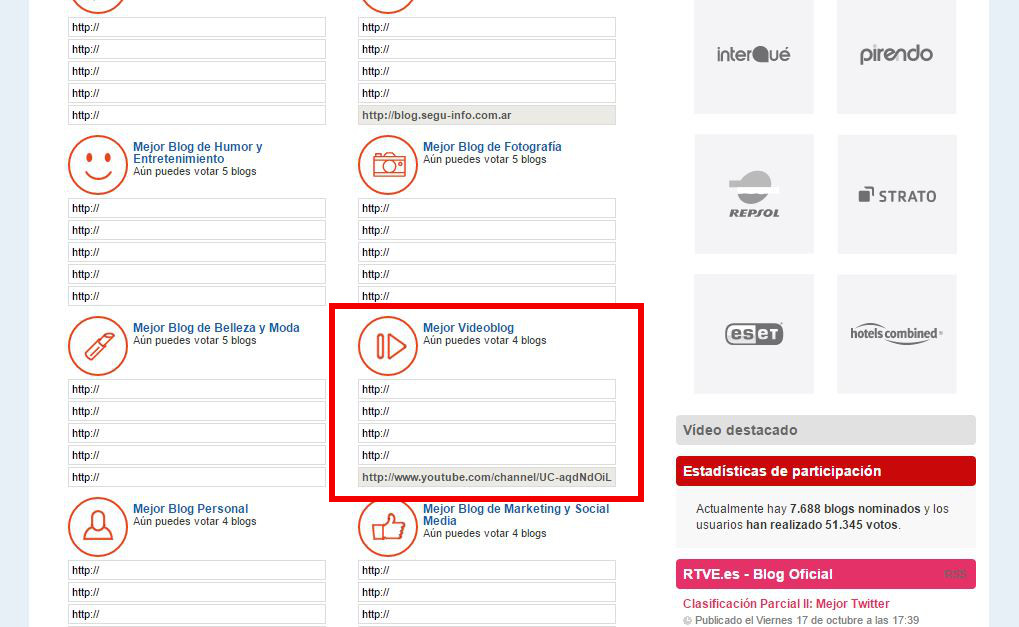 Os animamos a participar en las votaciones de los premios Bitácoras, donde nosotros participamos en la categoría de Videoblog.