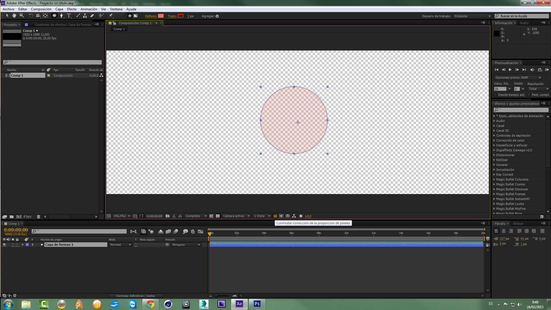 Al momento de crear una forma circular con los atajos de teclado (para crear un círculo perfecto) me salía un óvalo más alto y angoesto, o sea no era un círculo perfecto. Me dijeron que era por el aspecto del monitor. Luego, al importar una imagen rectangular de 400 ancho x 233 de alto (aunque igual pasa con las imágenes cuadradas) la imagen me sale desproporcionada y se ve como si se hubiera pixelado. La imagen original está hecha en Illustrator (a excelente resolución) y, desde el Adobe Photoshop, convertida en (*.png) para hacerla con fondo transparente.