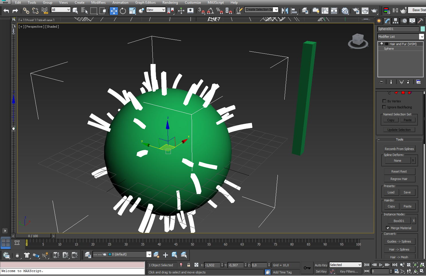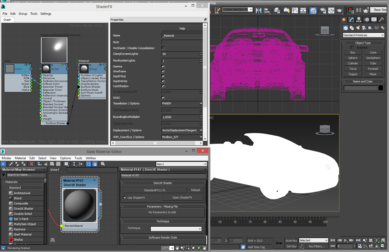Hago el material con el directX Shader para después poder usar el Shader FX, le asigno el Shader al objeto, no sé porque razón este sale completamente blanco, por lo que he visto en tutoriales esto no debería pasar, no estoy seguro si es un error del programa o si estoy haciendo algo mal, pero también he notado que sucede lo mismo cuando uso el modificador hair and fur, al agregarle geometría envés de cabello.