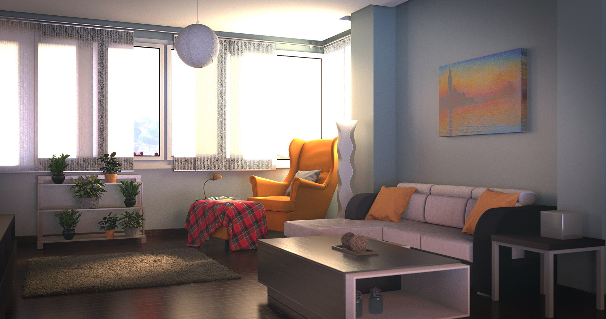 Aquí añado otra vista del ángulo contrario, me gusta menos, porque la esquina se me queda un poco vacía, pero no quería meter más cosas y acabar ralentizando aún más el render :-(Cycles. Tengo que probar a usar Octane o Thea.