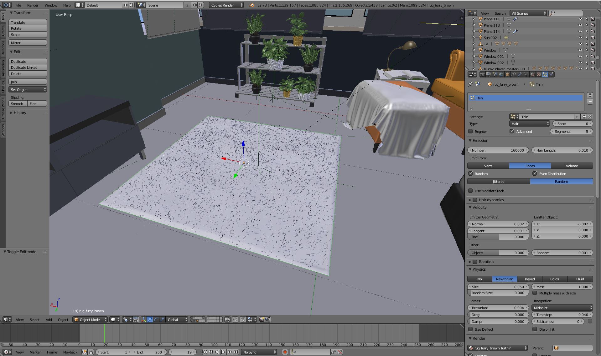 La alfombra es un plano subdividido y con un modificador displace con una textura procedural tipo cloud para darle un poco de relieve e irregularidad a la superficie y después tiene aplicado un sistema de partículas tipo pelo con el material para él plano un color marrón oscuro y para los pelos un material con color ramp o degradado para darle el variabilidad de color en las fibras. En realidad, es un asset de la Architecture Academy al que le he realizado algunos cambios. Saludos.