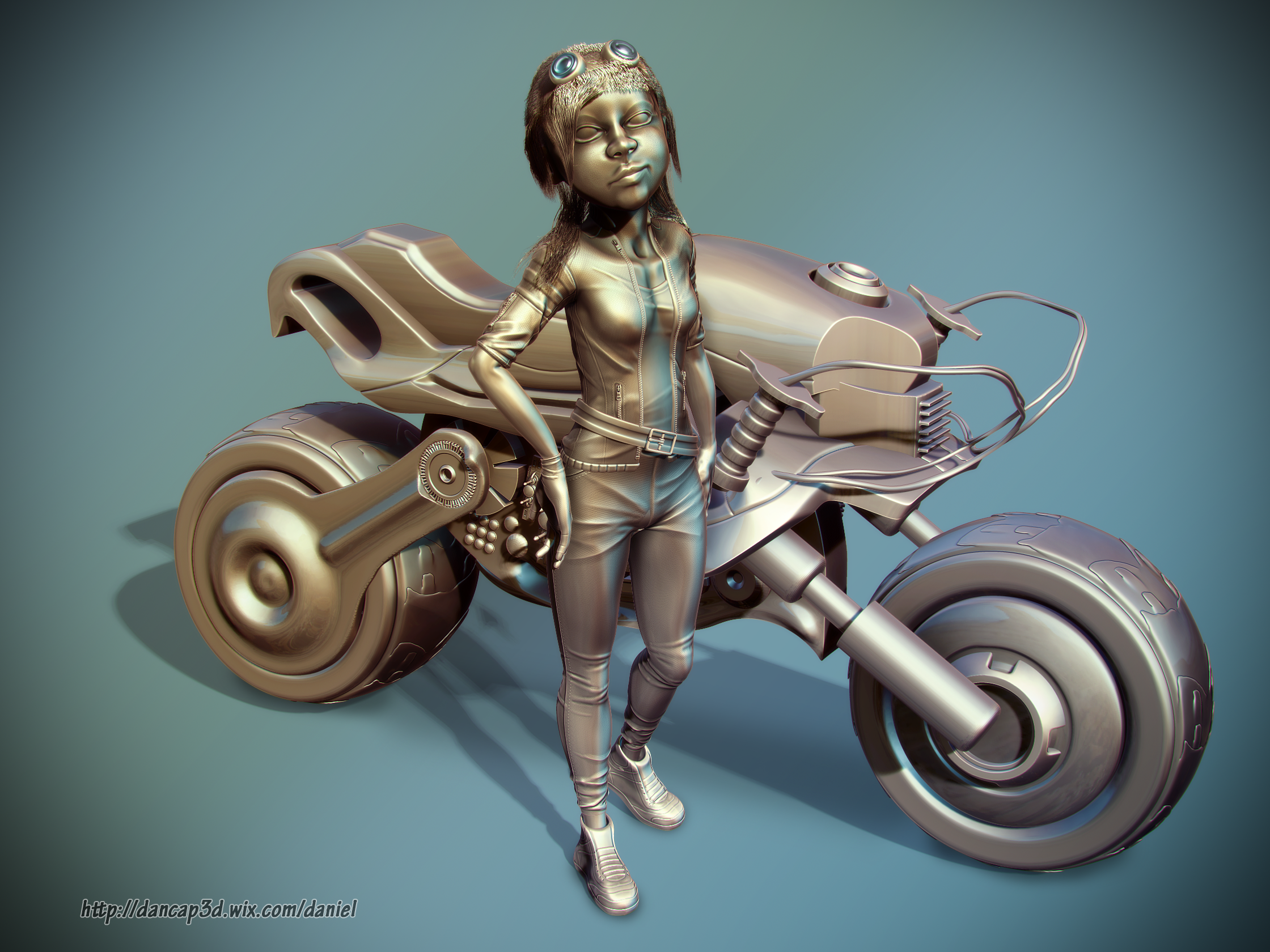 Saludos, ya tenía un tiempo que no dejaba nada por aquí, comparto mi último trabajo, realizado enteramente en ZBrush, la moto tiene cierto toque estilo akira y la composición final en Adobe Photoshop, debo decir que no es fácil ciertas posturas con transpose máster, (para los que lo usan ya saben) pero quería conseguir algo sin salir de ZBrush como ya hice en otras ocasiones, saludos.
