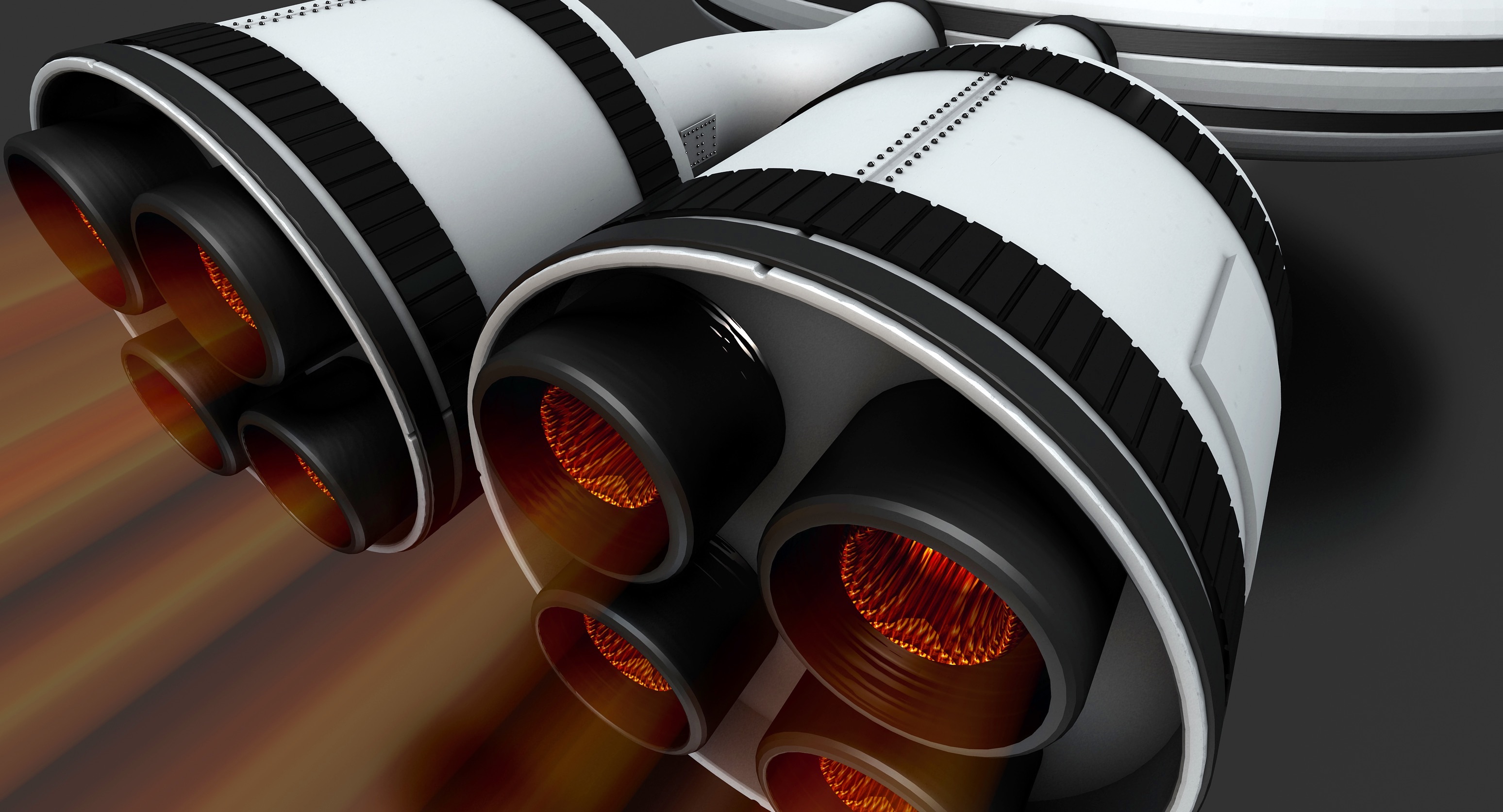 Hola, si lo que tratabas de conseguir es un buen efecto luminoso (según el título) para la propulsión de los cohetes, creo que está correcto, de hecho, a mí me parecen dos imágenes distintas, una parte con los propulsores y efectos luminosos y otra parte el resto de la nave, en la primera has conseguido bastante realismo, y en la segunda parece más bien un imagen cartoon, sobre todo en los detalles, ojo que no digo que esté mal, solo que parecen dos imágenes distintas, no sé si era tu intención, pero la nave bien podría estar en una película estilo Mortadelo y Filemón, un saludo amigo.