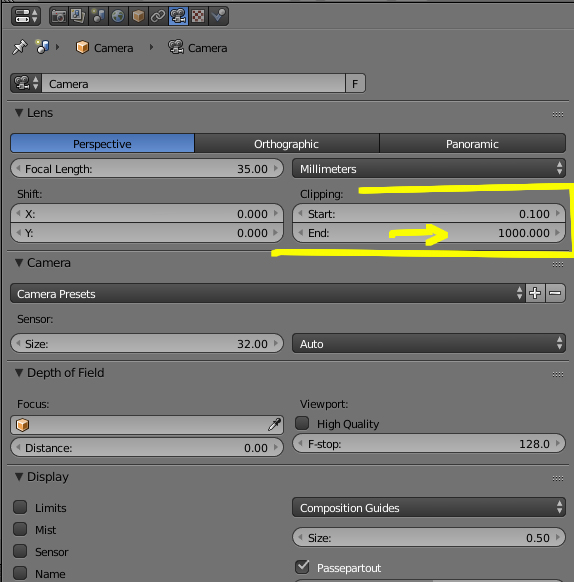 Selecciona la cámara y le subes el valor de END. -- IMÁGENES ADJUNTAS --