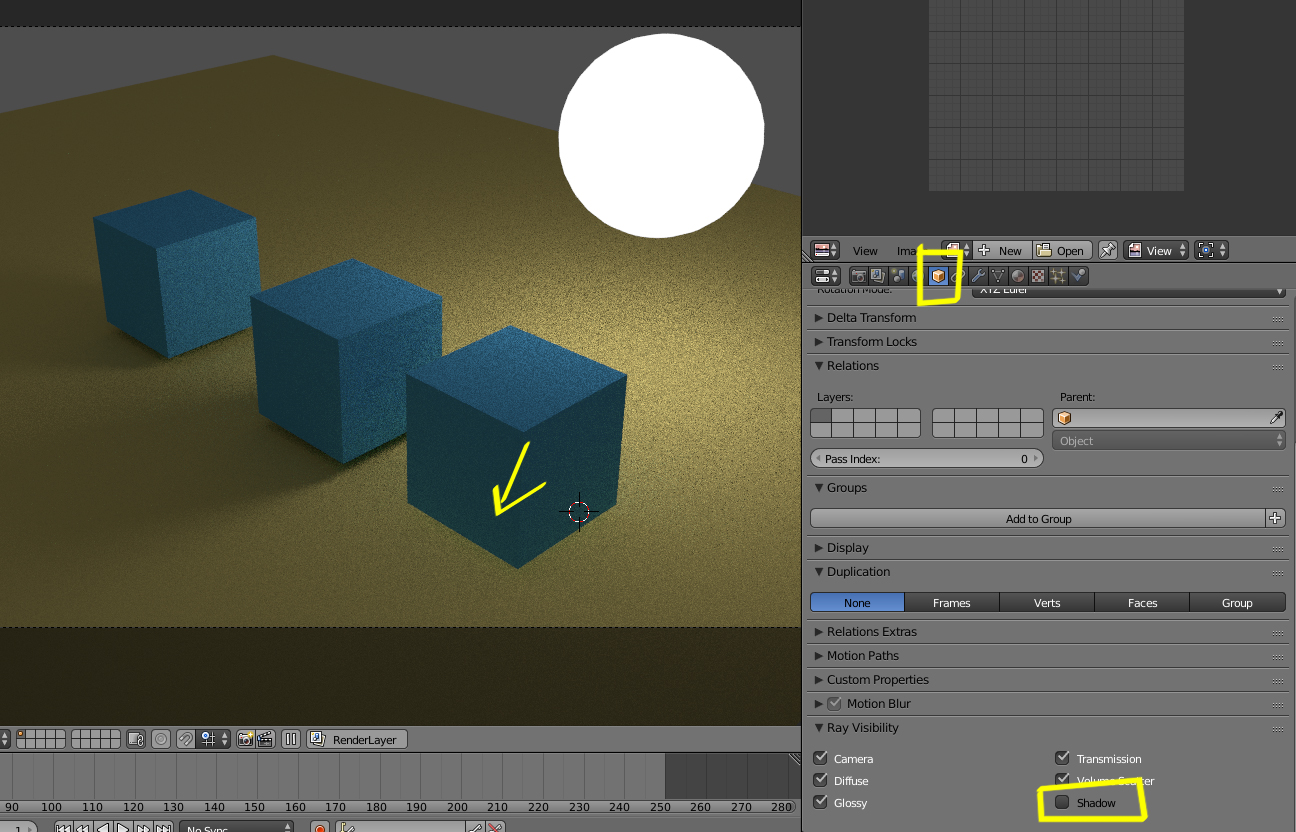Hola a todos.Se tiene una Esfera qué Emite Luz con una intensidad de 2.0. Entre esta Esfera y una pared paralela se ubica un Objeto que recibe la luz radiada y genera sombras en los pliegas de su forma, pero no proyecta sombra ni contra la pared ni contra el suelo.