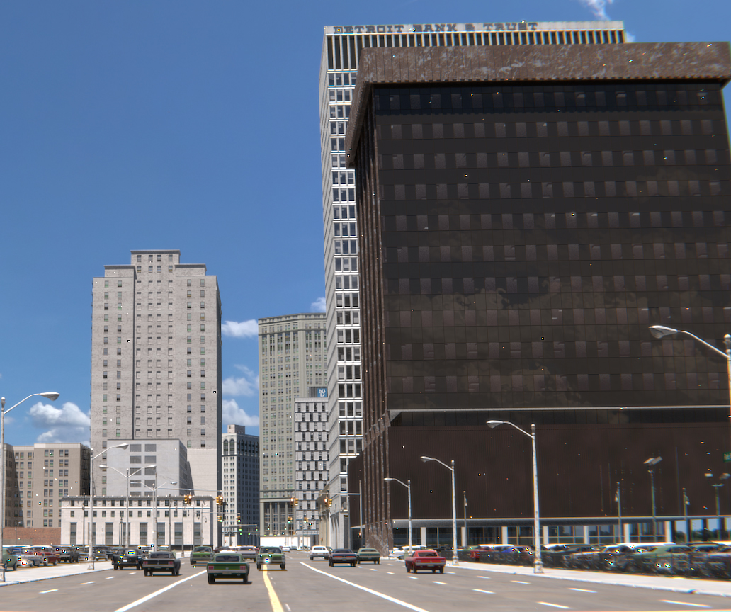 Los únicos cambios que hay entre renders es que el segundo tiene menos edificios y sí que hay una textura qué la volví a enlazar porque se había perdido la imagen, pero esa textura, aunque está en este modelo no se ve en la imagen. Las ventanas del edificio del fondo no las he tocado.