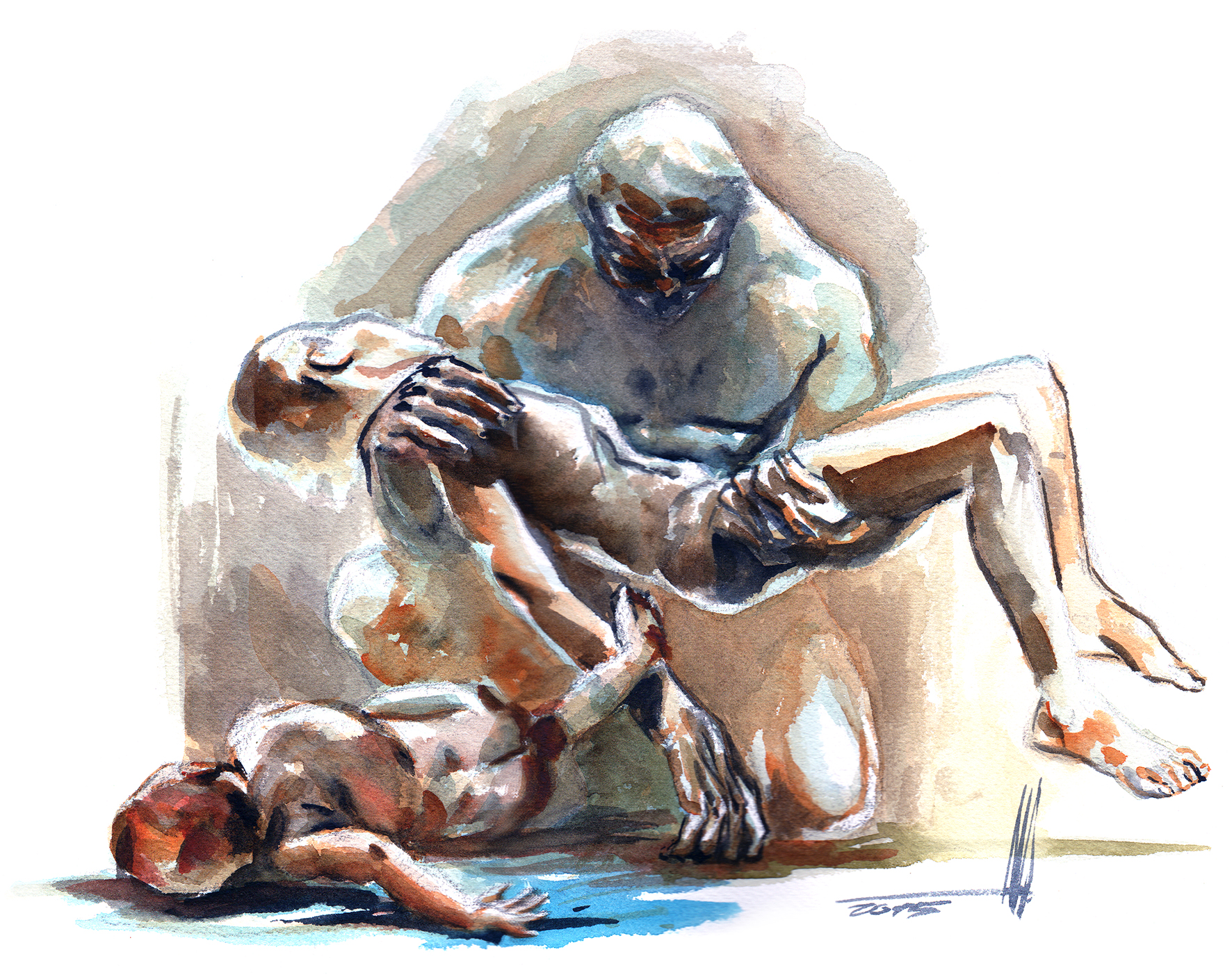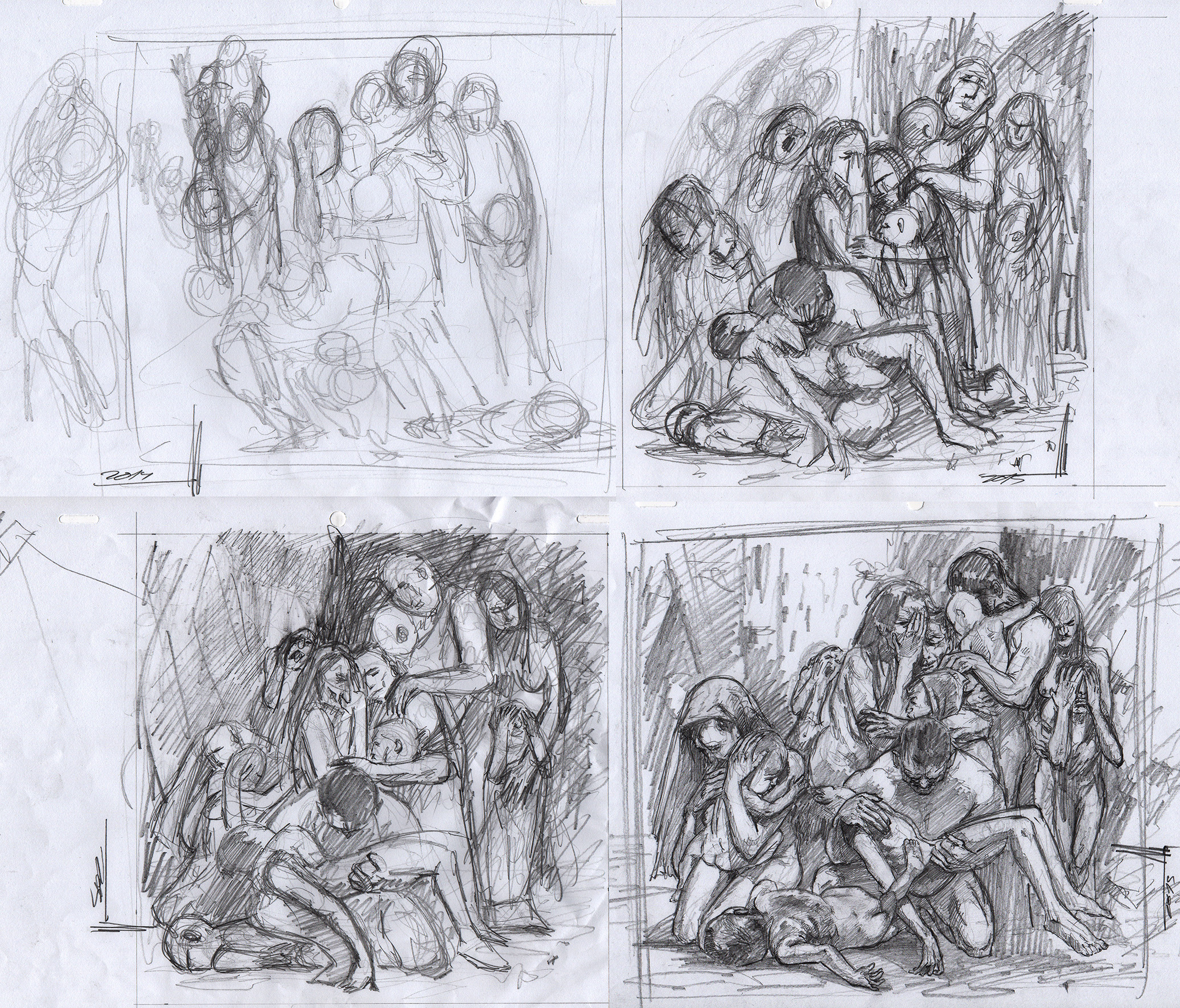 Ciertamente es de un metro cincuenta por un metro cincuenta. Algunos de los bocetos previos que realicé. Para el próximo voy a utilizar modelos, trabajar de cabeza es complicado.