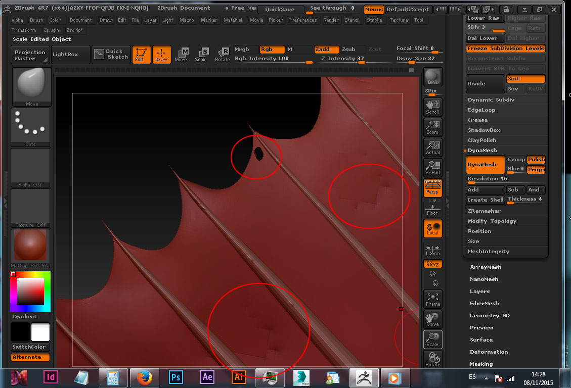 Hola Estoy modelando un detalle fino es la aleta de un pez en ZBrush, siguiendo algunos consejos muy buenos que me dieron aquí en el foro, solucione problemas anteriores a cerca de eso, pero ahora se me presentan otros que no tenía contemplado, todo está en ZBrush, a mí malla le ha salido un agujero, eh visto que hay quienes usan inflate hacen una bola sobre el agujero, luego dan a DynaMesh y suavizan y desinflan y listo se cierra, pero ello deforma la malla, y a mí me gustaría evitar eso, ya la tengo justo como quiero solo es cerrar el agujero, también hay partes que no están agujeradas visiblemente, pero los polígonos no están unidos y se nota ligeramente me di cuenta al inflar esas partes con ello se hace más evidente que hay agujeros en la malla aún que los polígonos están muy juntos y se disimulan, pero no del todo en esas aéreas se ve imperfecta la malla, adjunto una imagen donde marque 3 círculos uno para él problema del hueco evidente y los otros 2 donde la malla también está agujerada, pero solo se ve imperfecta, espero me puedan aconsejar algo lo que más me interesa es la parte del agujero, por cierto, es una malla completa, no parte de un plano, me gustaría saber también lo inverso, es decir ¿se pueden crear agujeros en la Maya? ¿Y cómo puedo hacerlo?