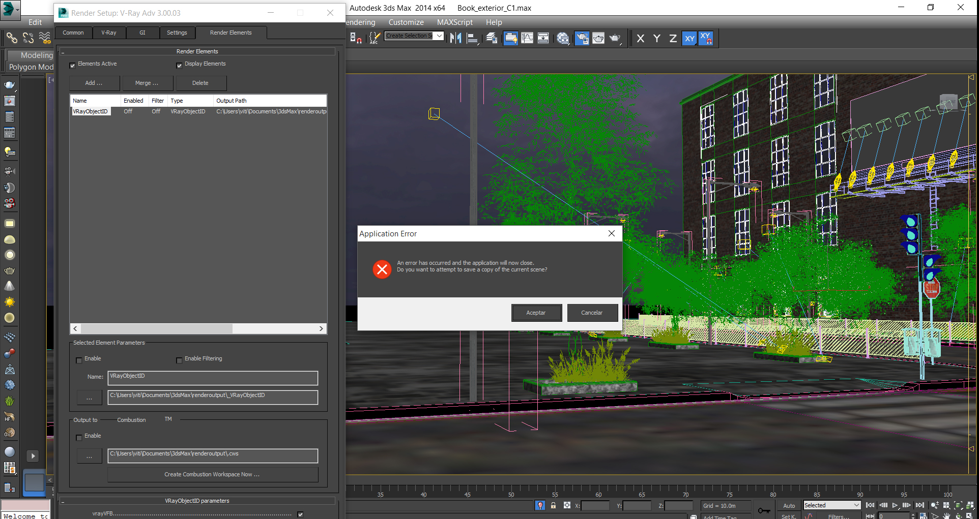 Buenas. Estoy trabajando con un proyecto y estaba definiendo los valores para él render final y sacando los renders elements que normalmente utilizo, esta vez, no sé qué pasa muy bien, que cuando doy añadir a cualquier render element me sale un error y automáticamente se cierra el 3ds Max, he estado investigando, pero no consigo averiguar nada, ¿alguien ha tenido el mismo problema alguna vez? ¿hay alguna solución? Normalmente suelo trabajar con ellos para luego en postproducción darle más vida al render.