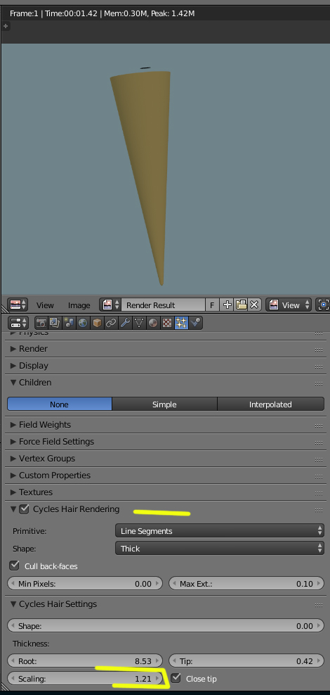 Hola. Estoy creando césped para mí escena, esto lo hago con particles de tipo Hair, pero en vez de salir tiras de césped salen conos. Esto solo me pasa con este terreno, pues creé un nuevo plano para probar y le puse la configuración de las partículas del primero y no da problemas.