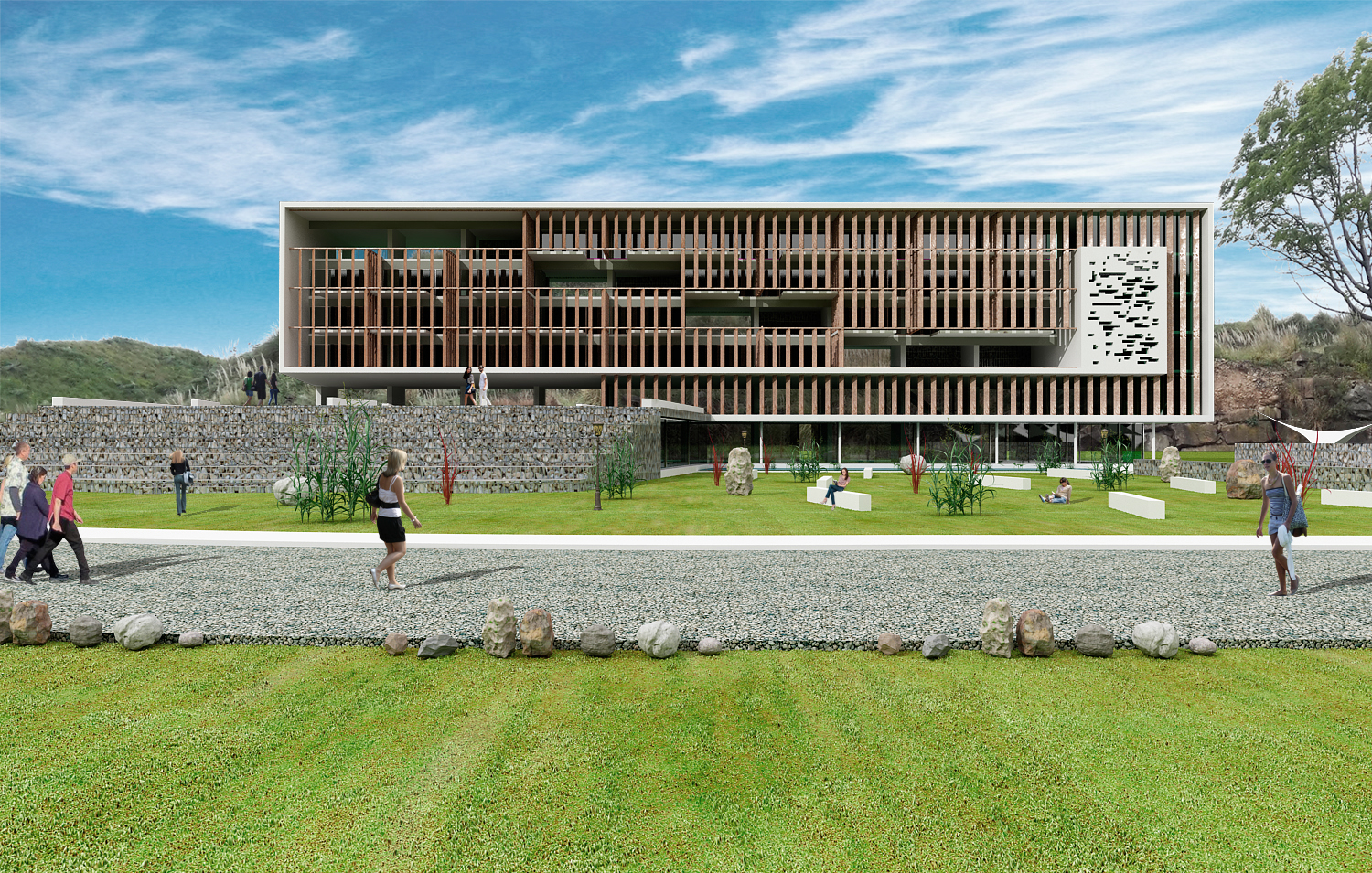 Comprendo lo del displacement, consume muchísimo tiempo de Renders y el cliente, no nos puede esperar, lo sé, de todas maneras, así, tal cuál está el trabajo, si pudieras bajar la intensidad del pavimento del trayecto de ingreso, te favorecería, por otro lado, si puedes tratar de ajustar con Adobe Photoshop esos tileados del césped no llevaría mucho tiempo y quedaría mejor en ambos casos, Ten cuidado con las escalas entre la vegetación y los objetos (llámese, rocas, gente, etc.)