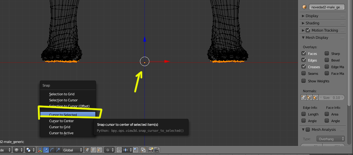 Esto se hace seleccionando la base de los pies en Edit Mode, y con Shift+S > Cursor to Selected (poner el cursor en lo seleccionado).
