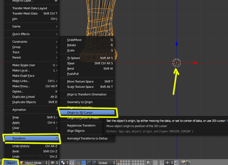 Y una vez tienes el cursor, se coloca el Origin en ese punto estando en Object Mode, con Object > Transform > Origin 3D Cursor (colocar el Origin en la posición del Cursor).