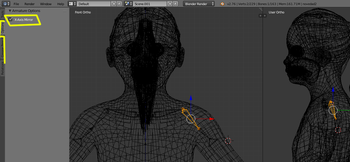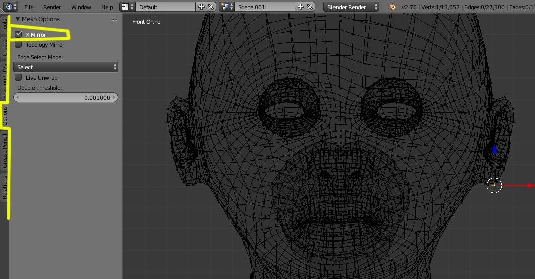 Y decir, que si tuvieras que retocar alguna zona (mover vértices), al ser un modelo simétrico, se ha de hacer activando la simetría de Mesh Options > X Mirror.