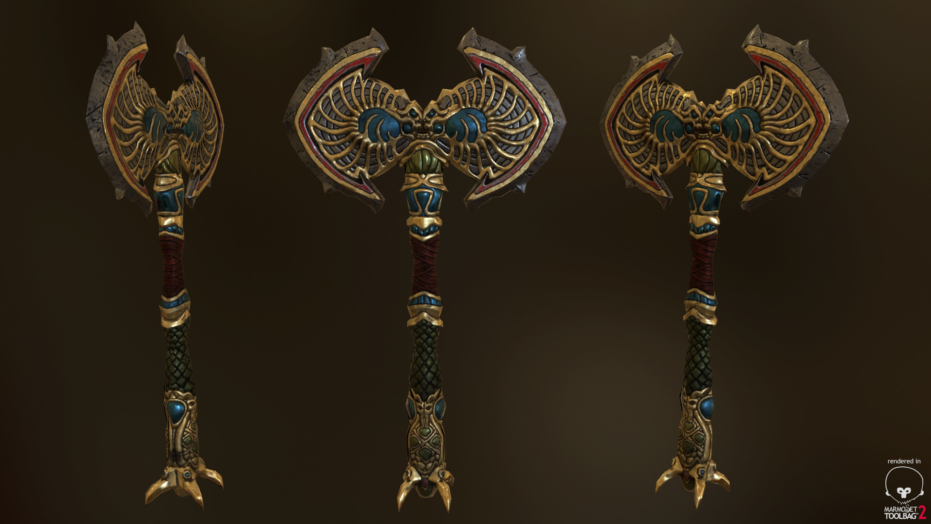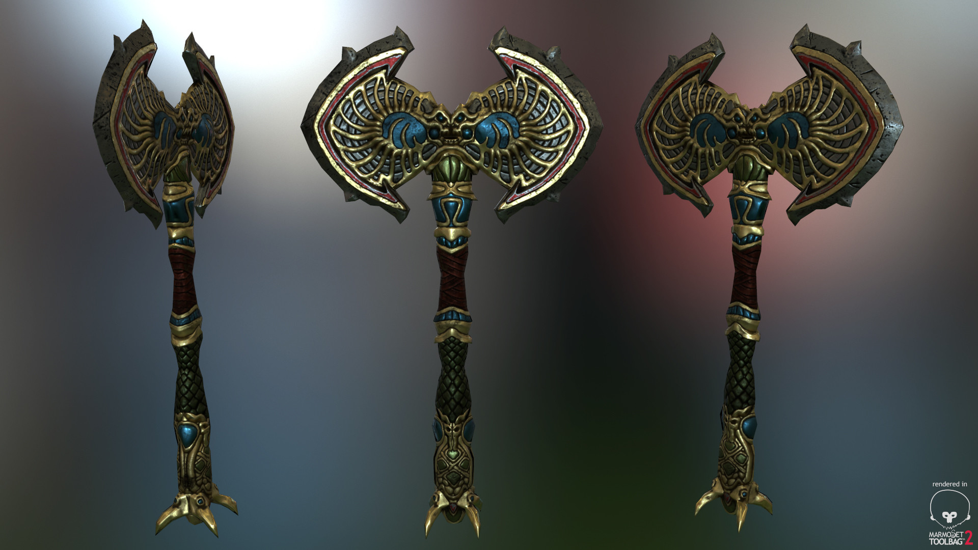 Aquí está el Hacha con las texturas terminadas aquí lo pueden ver en tiempo real https://www.artstation.com/artwork/r02m6.