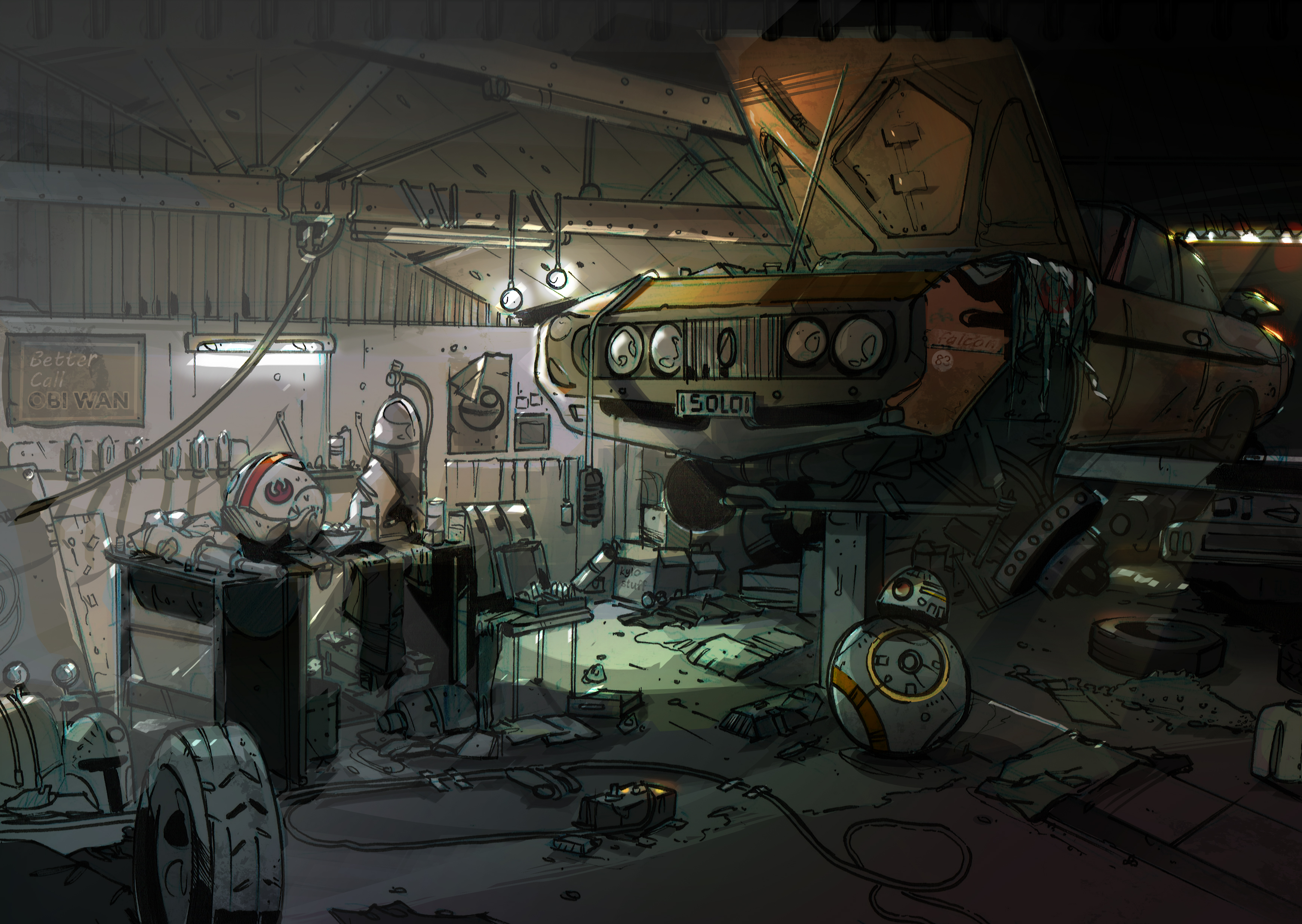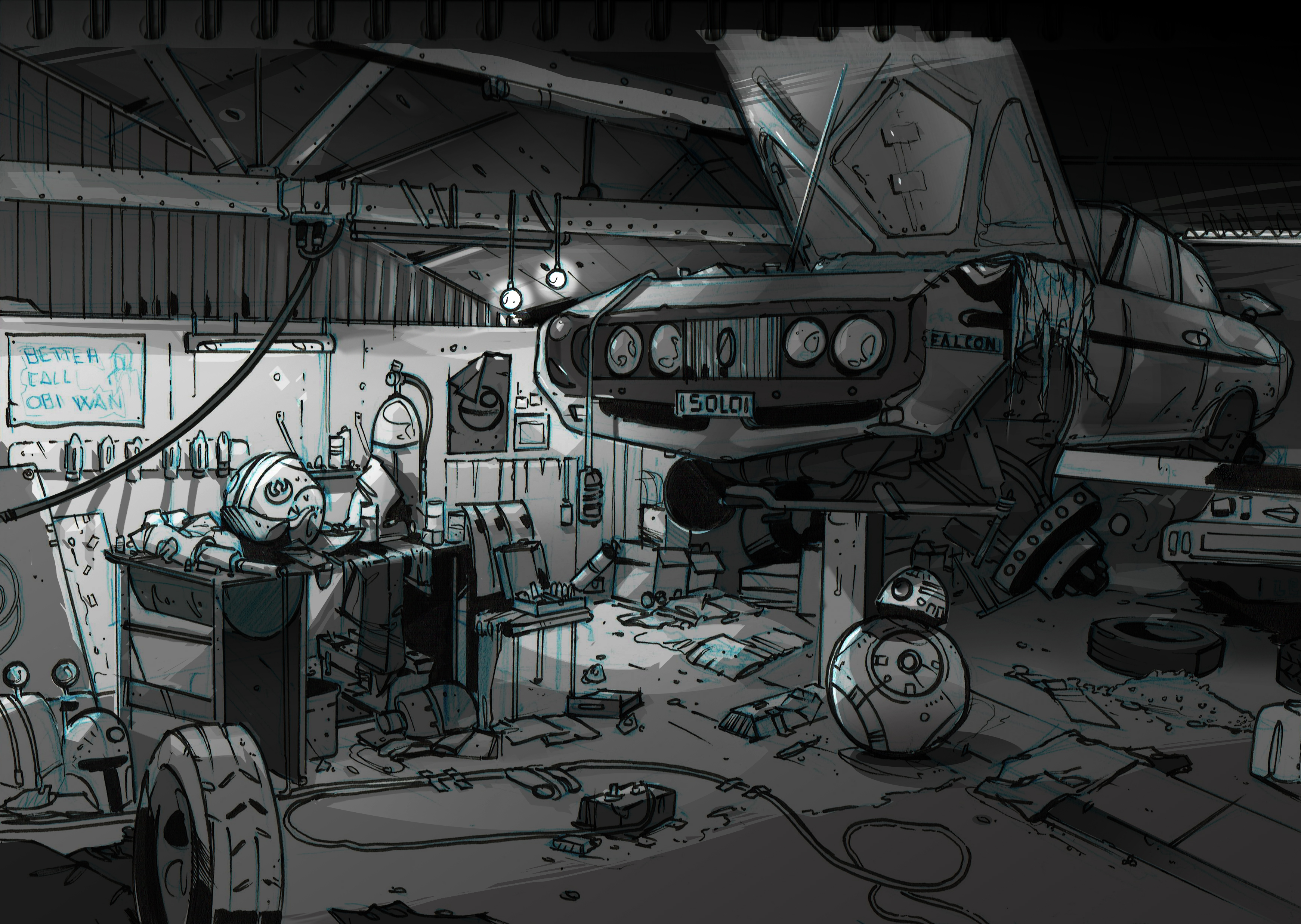Ok, así se queda el garaje de han solo, no puedo dedicarle más tiempo, pero ha sido interesante, el estudio de la luz y demás, dejo algunos easter eggs también.