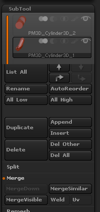-He creado un esqueleto simétrico con las Zspheres, cuando he acabado, lo he convertido en una imagen manipulable con unified skin. Luego, he ido creando subtool para crear la mano, los dedos y las uñas. No he tenido problema para acoplar estas subtols en una. Pero ahora que quiero unirlas todas en una, no me deja, la opción de subtool/merge/merge do, desaparece cuando solo me quedan dos capas por fusionar. ¿cómo puedo unificar estas capas?