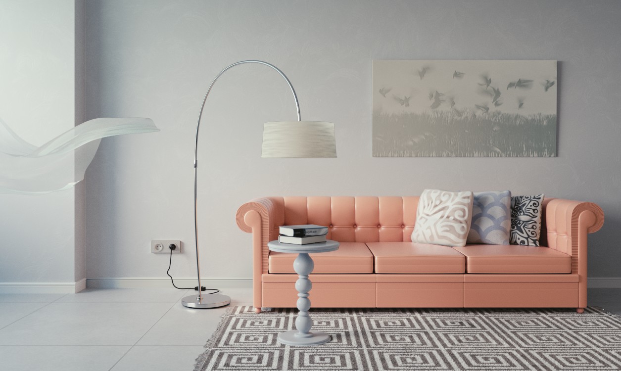 Ya qué mencionas la composición, yo opino que manteniendo ese encuadre todo quedaría mejor integrado si inviertes horizontalmente la posición de la lámpara, la mesa, el cuadro y los cojines con respecto al sofá y llevases al conjunto más hacia el centro de la escena. O directamente poner la ventana y cortina en la derecha y desplazar el resto más a la izquierda.