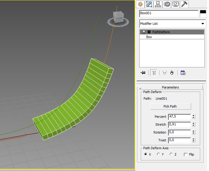 Como su nombre lo indica, sólo necesitás el modificador Path Deform, (lo encuentras en la sección World-Space Modifiers de la Modifier List), cuyo avance por el path consigues cuando animas el valor Percent.
