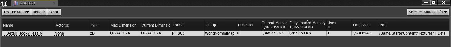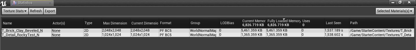 Después creo dos instancias y a cada una de ellas le cambio el parámetro por defecto del normal map del material base y escojo otro completamente distinto. Si miro dentro de las estadísticas de las texturas, obtengo esto: