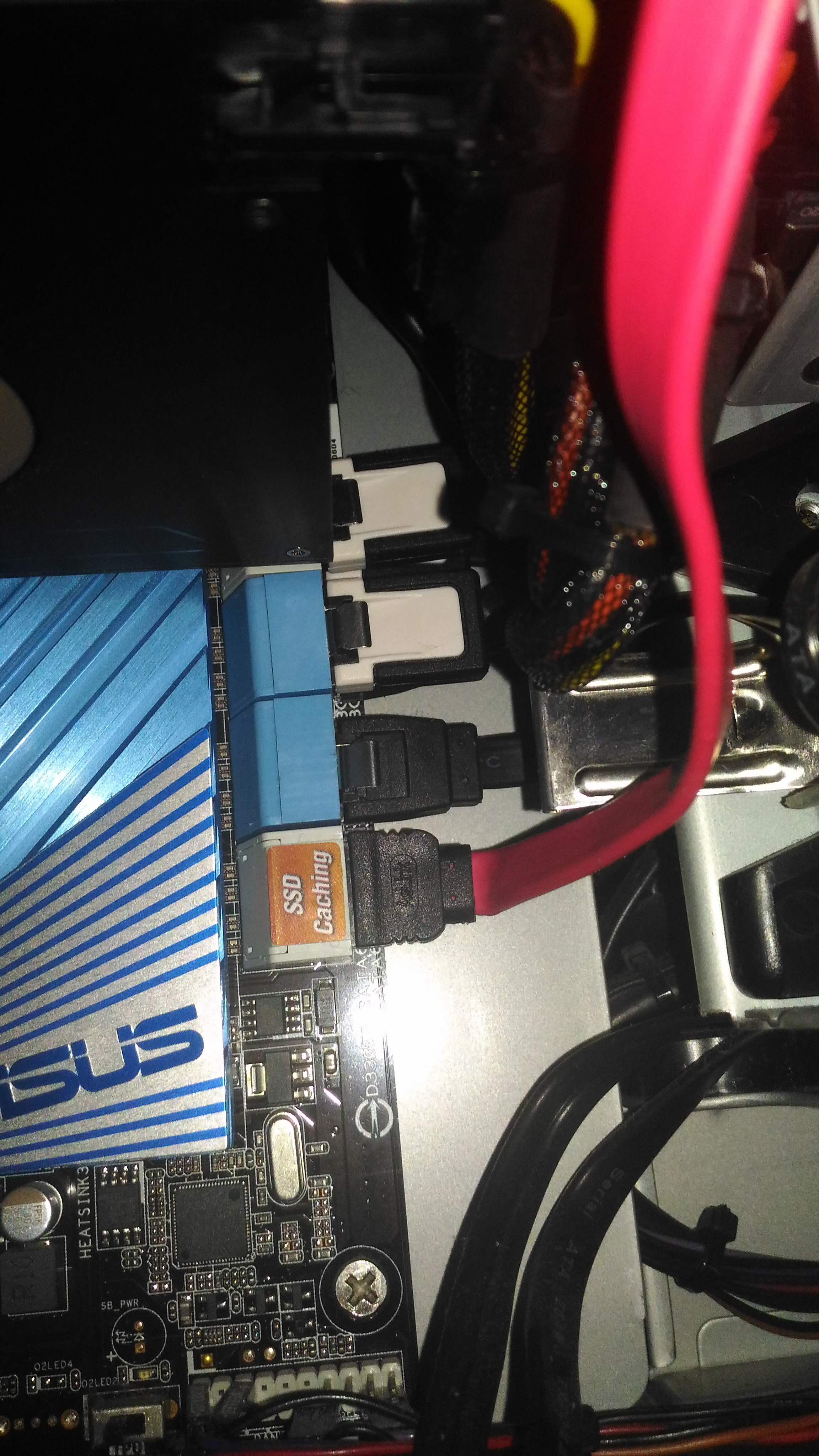 El rojo, conectado al Samsung, que ahora está en el SATA 6gb/s y que pone SD caching, pasa a el otro SATA 6GB/s que no se ve y está debajo de la tarjeta gráfica, o sea, uno por el otro.