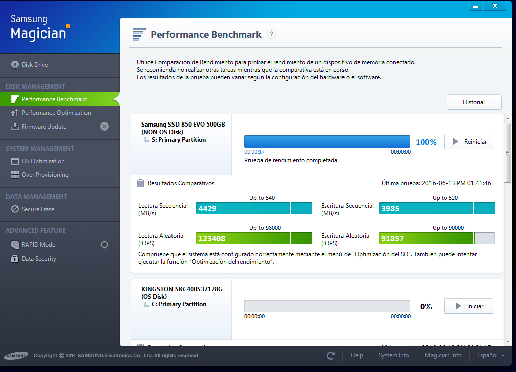 Como puedes ver las pruebas están hechas con el mismo software que facilita Samsung con el disco. En la pantalla principal el propio software ya te indica si la conexión que has escogido es la óptima y la qué ofrece el mejor resultado.