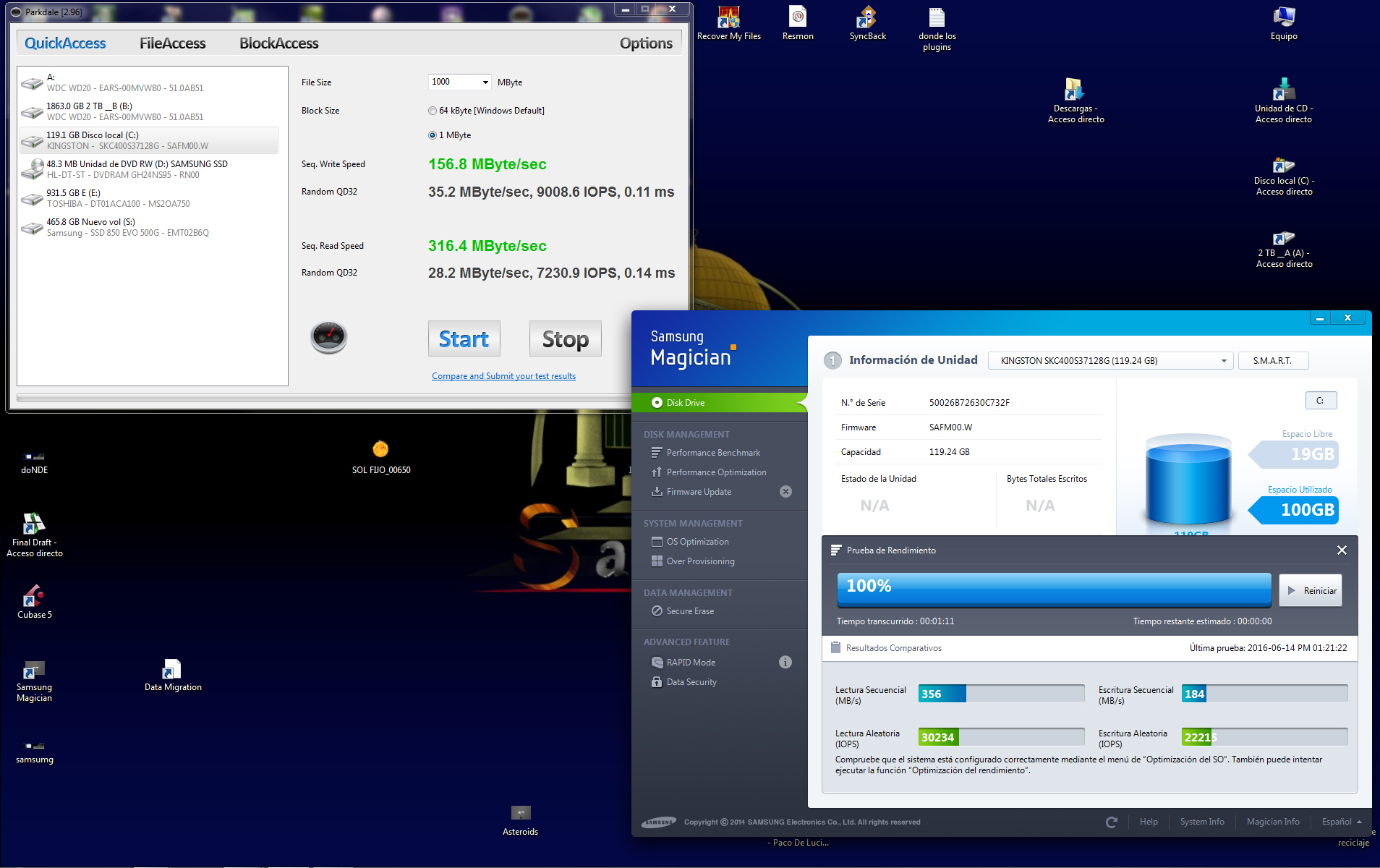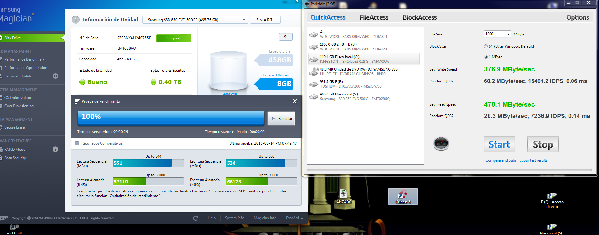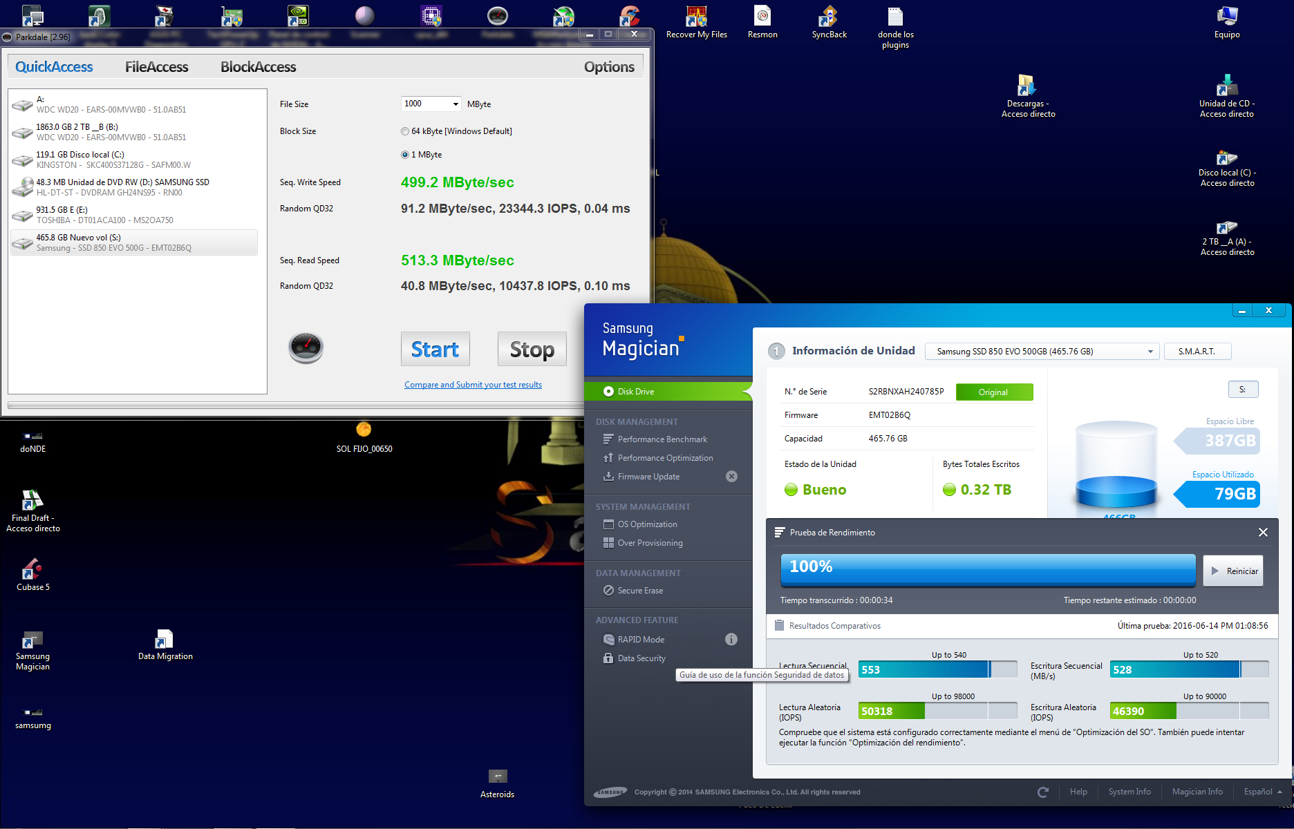 Pues ya va llegando el material que pedí aconsejado por AlphaCAD, y he colocado el SSD un Samsung 850 EVO - SD (SD 500 GB, Serial ATA) y al testear sus velocidades me ha dado:
