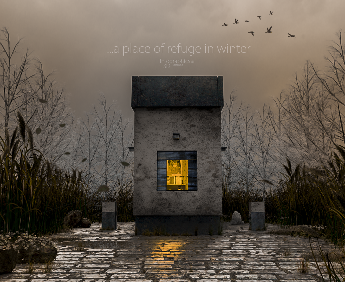Texturas, ambiente y modelado muy buenos, pero me resultan extrañas las proporciones del suelo y el refugio, en cualquier caso, buen trabajo, un saludo.