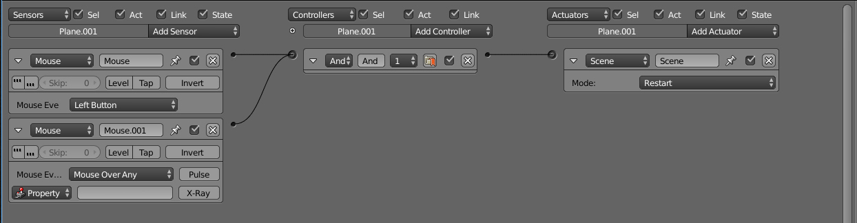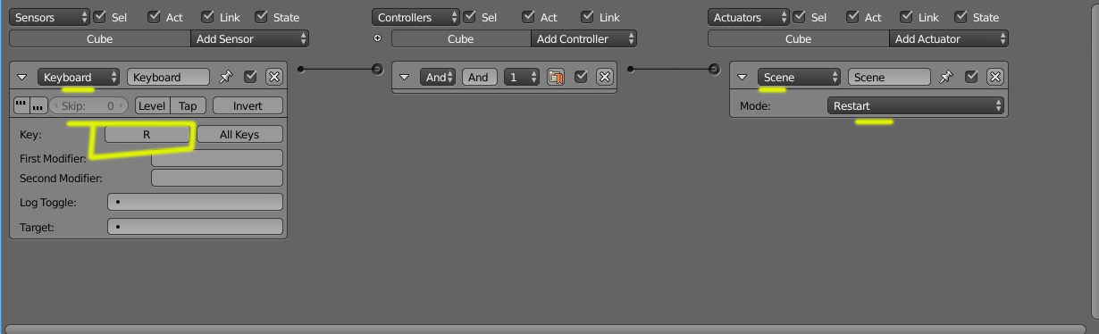 Un sensor Keyboard(teclado) y un actuador Scene, donde se restaura (Restar) la misma escena.