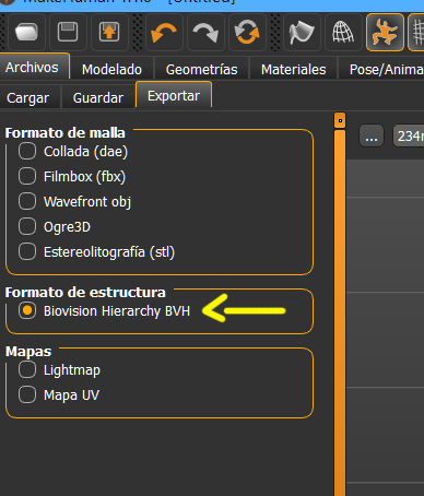 Hay una opción de exportar el BVH, pero es un poco lioso y hay que borrar la armature, cargar la BVH y adaptarla al modelo que no es lo que se dice fácil cuando no se conocen los truquitos.