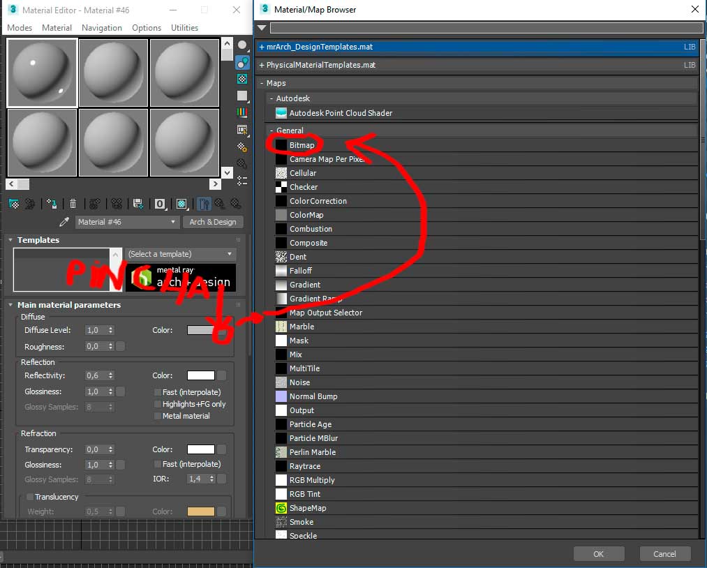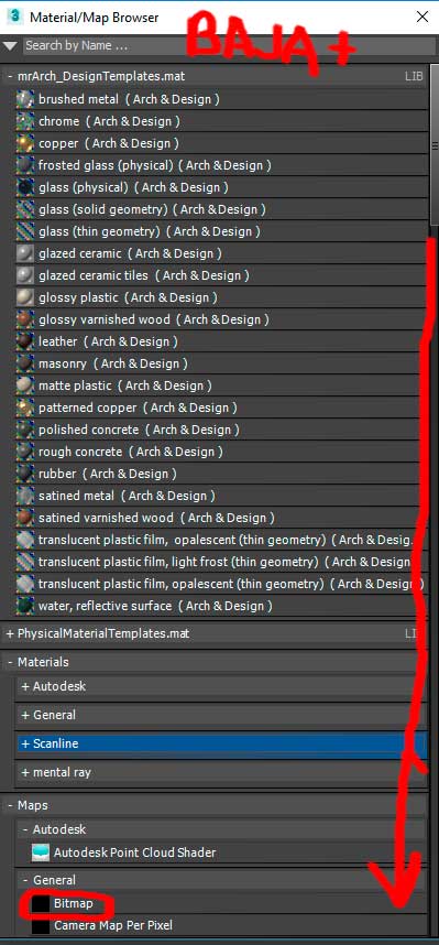 Hola, espero que me puedan ayudar. Quiero ponerle una imagen como textura a una pared, pero cuando doy click en la opción Arch and design me abre una ventana, pero no me aparece la opción de bitmap para cargar la imagen. Saben a qué se debe?