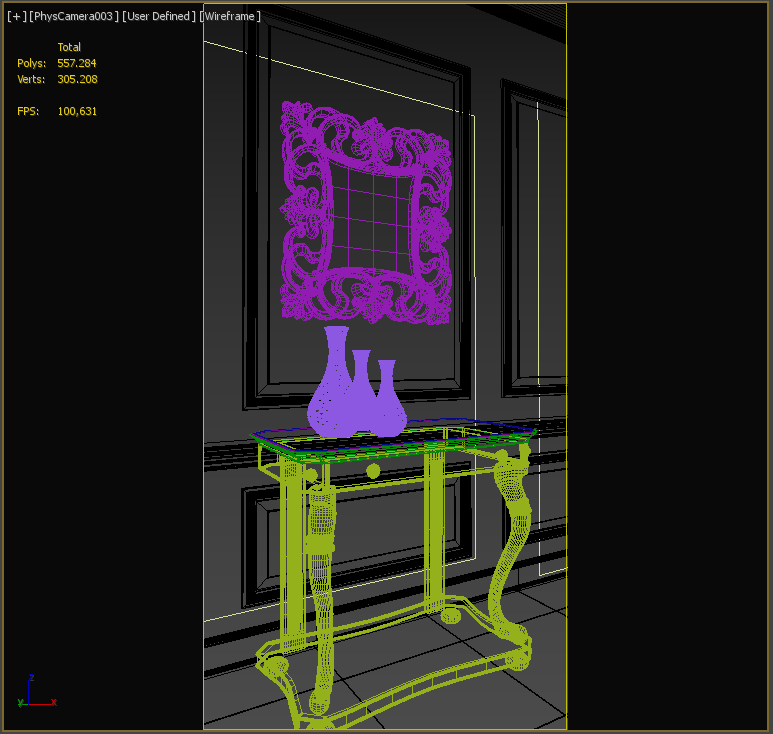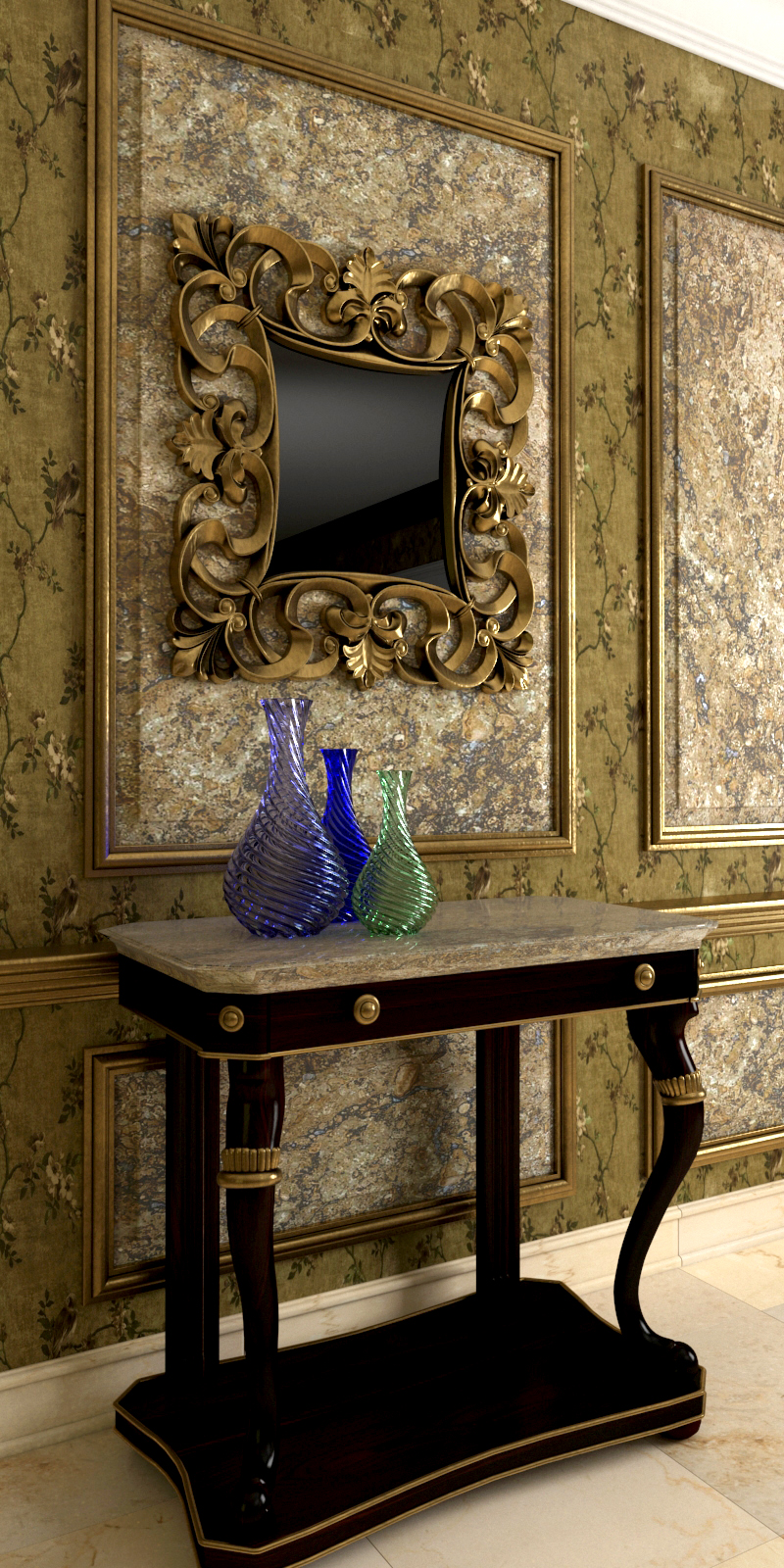 Hubiera quedado mejor, simplemente un render frontal y más de cerca, de los jarrones reflejados en el espejo con ese marco, por ejemplo.