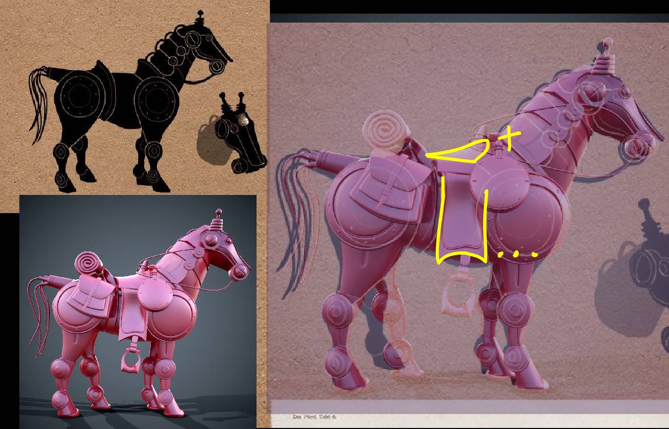 Hola, gran trabajo, en lo referente a los platos en el concept se ven como juntas, dos piezas unidas por un pasador (como el simbolo de steam), con lo que pivota sobre esa unión, pero en tu modelo parecen una especie de escudos puestos en las articulaciones, por eso, al no tener continuidad con su respectiva parte de la pierna, parece que en un lado estén en el exterior y en el otro en el interior, aunque fijandose bien se ve que están en ambos lados en el exterior y en el interior.