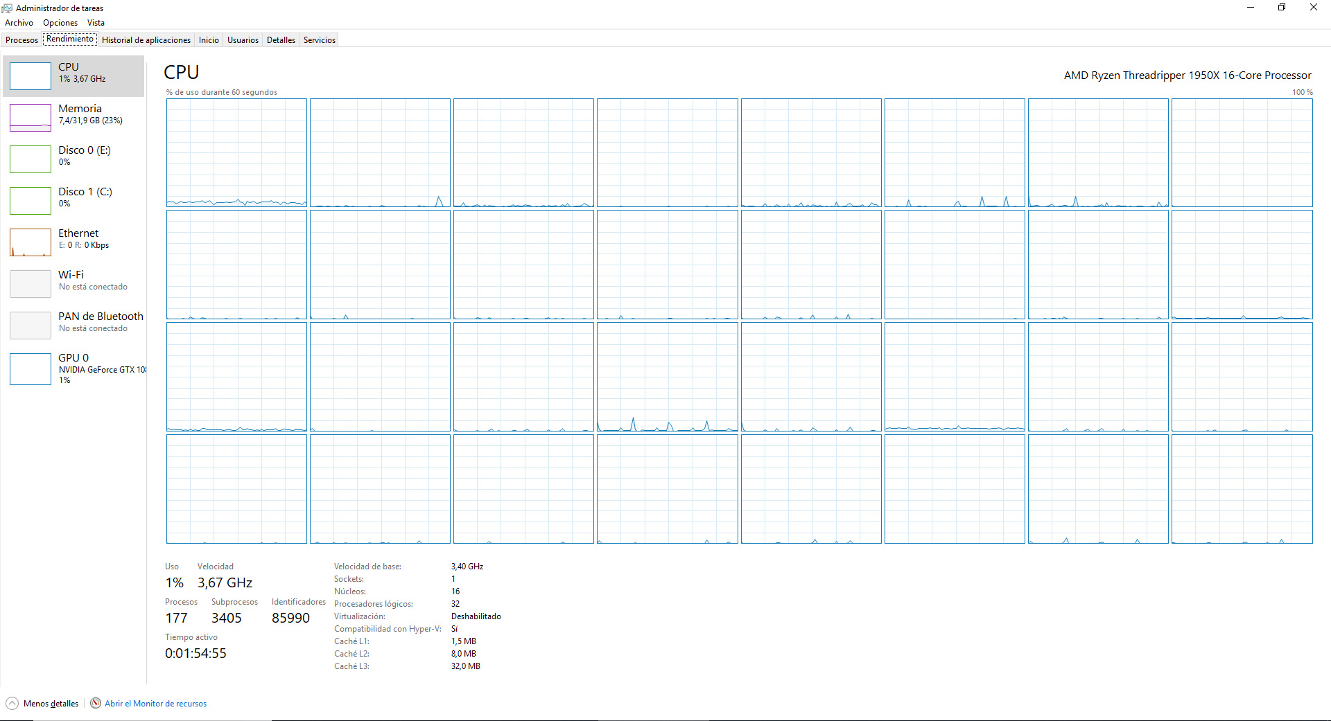 He abierto el administrador de tareas y he visto que hay 177 procesos en ejecución, pero no sé si eso es normal ya que llevo poco tiempo con este ordenador y no sé cuántos procesos había antes. He comparado con mi otro equipo que tiene un procesador Intel i7 (con Windows 7) de hace 8 años y tiene alrededor de 80 procesos y 1600 subprocesos. No juego juegos ni visito páginas sospechosas, solo utilizo el ordenador para trabajar con 3DS Max y Adobe Photoshop.